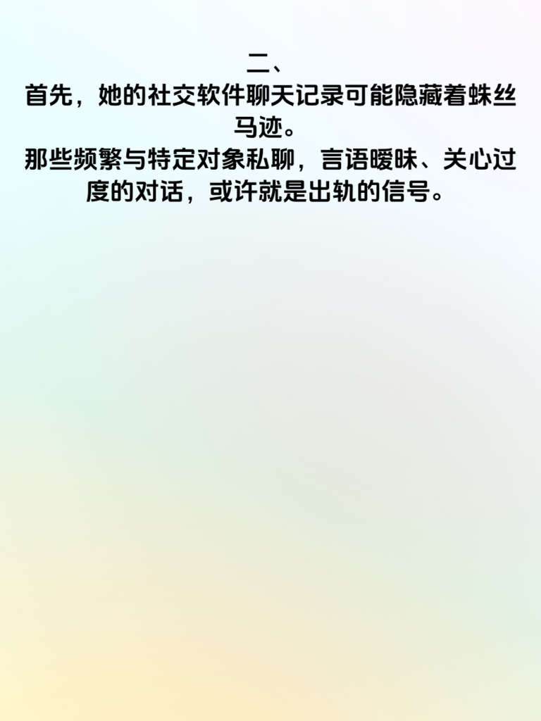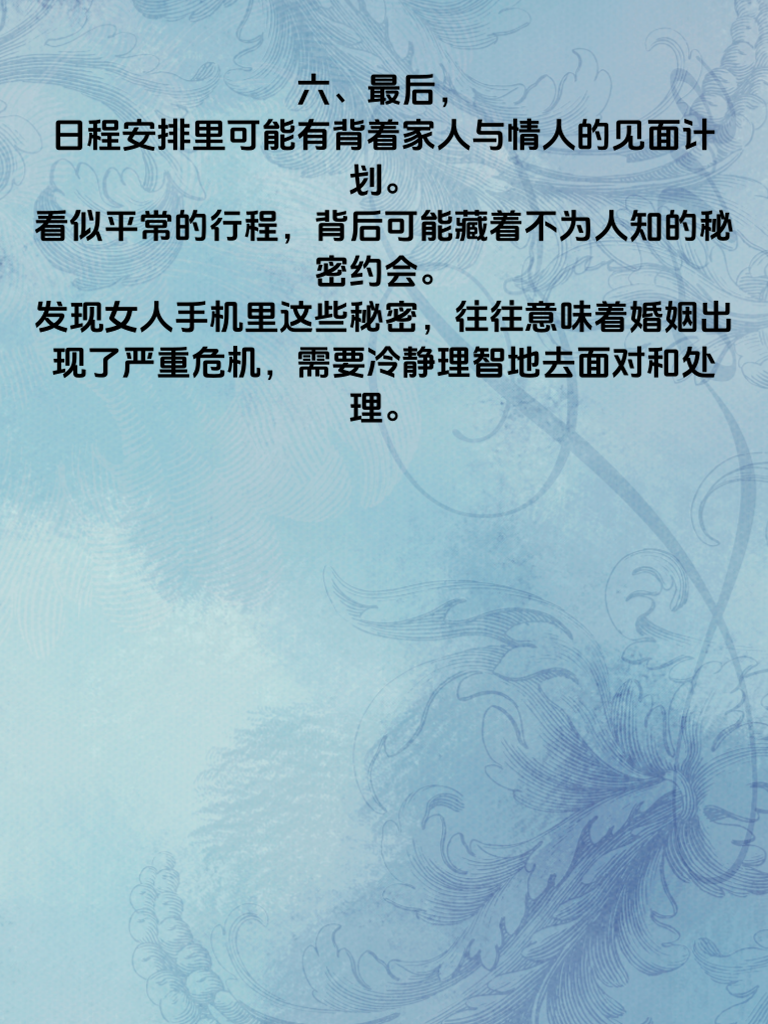 一、婚内出轨,这是一个沉重且敏感的话题,尤其是当涉及到女人手机里藏着的秘密时。女人若婚内出轨,手机往往是关键所在。 二、首先,她的社交软件聊天记录可能隐藏着蛛丝马迹。那些频繁与特定对象私聊,言语暧昧、关心过度的对话,或许就是出轨的信号。 三、其次,相册里可能有与出轨对象的合照。也许是偷偷的约会留念,或是一些只有他们懂的场景记录。 四、再者,通话记录也不容忽视。经常与同一个号码长时间通话,甚至避开另一半接电话,都值得警惕。 五、另外,手机里的支付记录说不定能发现她为出轨对象的消费。比如购买礼物、外出约会的费用等。 六、最后,日程安排里可能有背着家人与情人的见面计划。看似平常的行程,背后可能藏着不为人知的秘密约会。发现女人手机里这些秘密,往往意味着婚姻出现了严重危机,需要冷静理智地去面对和处理。