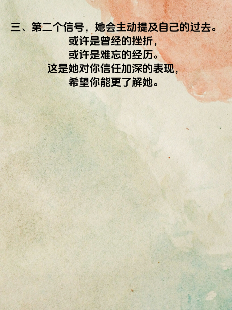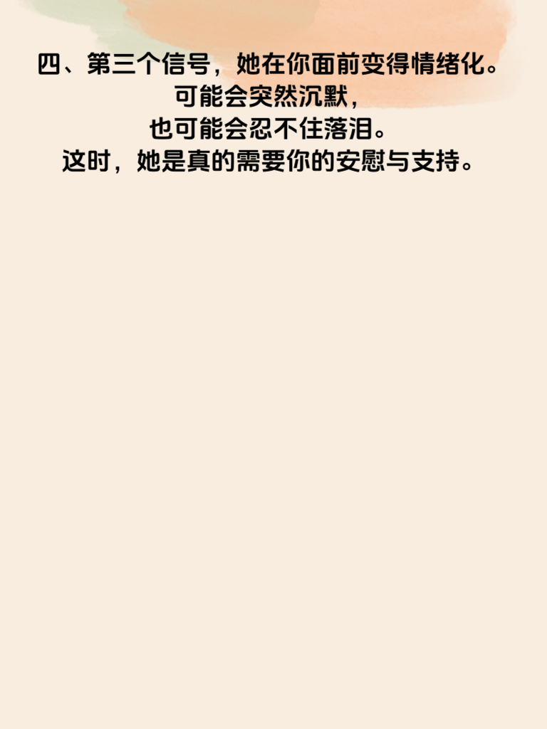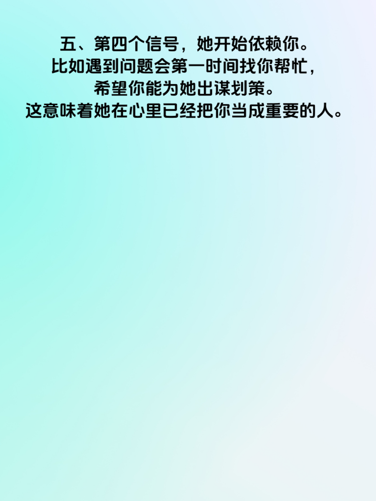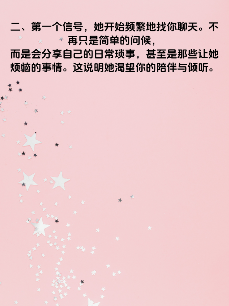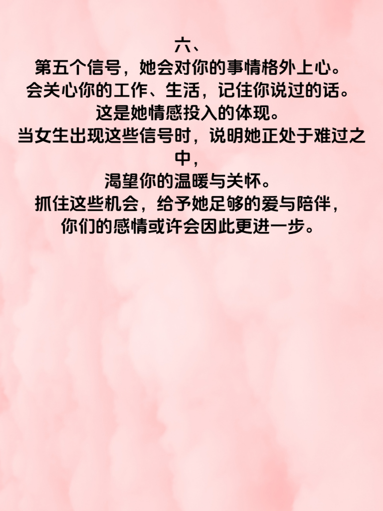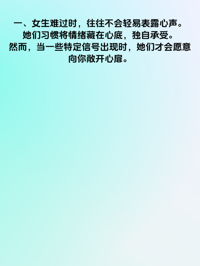 一、女生难过时,往往不会轻易表露心声。她们习惯将情绪藏在心底,独自承受。然而,当一些特定信号出现时,她们才会愿意向你敞开心扉。 二、第一个信号,她开始频繁地找你聊天。不再只是简单的问候,而是会分享自己的日常琐事,甚至是那些让她烦恼的事情。这说明她渴望你的陪伴与倾听。 三、第二个信号,她会主动提及自己的过去。或许是曾经的挫折,或许是难忘的经历。这是她对你信任加深的表现,希望你能更了解她。 四、第三个信号,她在你面前变得情绪化。可能会突然沉默,也可能会忍不住落泪。这时,她是真的需要你的安慰与支持。 五、第四个信号,她开始依赖你。比如遇到问题会第一时间找你帮忙,希望你能为她出谋划策。这意味着她在心里已经把你当成重要的人。 六、第五个信号,她会对你的事情格外上心。会关心你的工作、生活,记住你说过的话。这是她情感投入的体现。当女生出现这些信号时,说明她正处于难过之中,渴望你的温暖与关怀。抓住这些机会,给予她足够的爱与陪伴,你们的感情或许会因此更进一步。