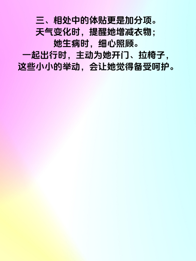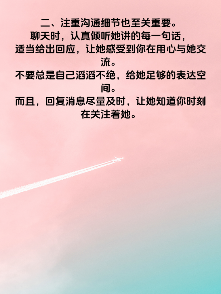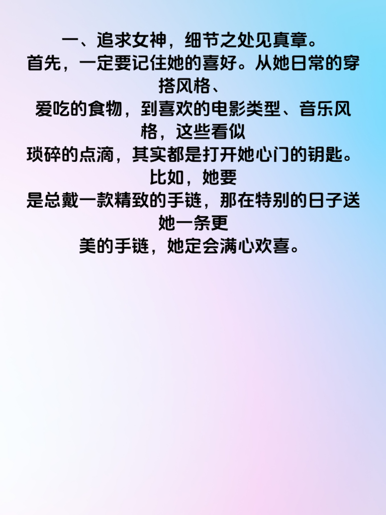 一、追求女神,细节之处见真章。首先,一定要记住她的喜好。从她日常的穿搭风格、爱吃的食物,到喜欢的电影类型、音乐风格,这些看似琐碎的点滴,其实都是打开她心门的钥匙。比如,她要是总戴一款精致的手链,那在特别的日子送她一条更美的手链,她定会满心欢喜。 二、注重沟通细节也至关重要。聊天时,认真倾听她讲的每一句话,适当给出回应,让她感受到你在用心与她交流。不要总是自己滔滔不绝,给她足够的表达空间。而且,回复消息尽量及时,让她知道你时刻在关注着她。 三、相处中的体贴更是加分项。天气变化时提醒她增减衣物,她生病时细心照顾。一起出行时,主动为她开门、拉椅子,这些小小的举动,会让她觉得备受呵护。 四、还有,在她遇到困难时,坚定地站在她身边,给予实际可行地帮助和鼓励。让她明白,你是可以依靠、值得信赖的人