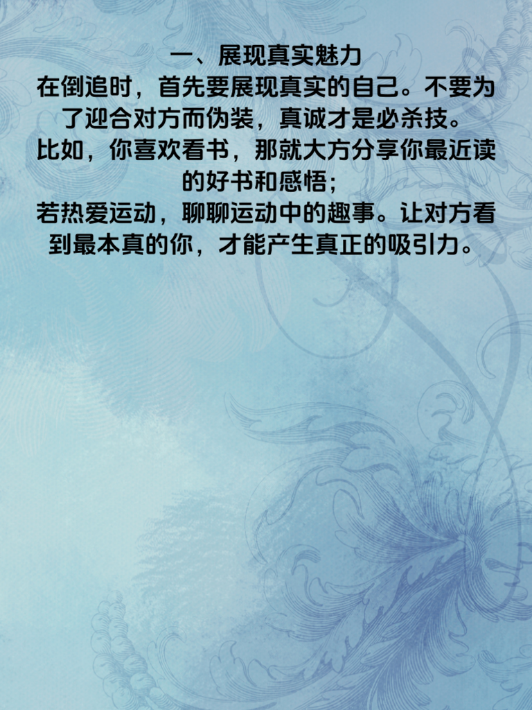 一、展现真实魅力 在倒追时,首先要展现真实的自己。不要为了迎合对方而伪装,真诚才是必杀技。比如,你喜欢看书,那就大方分享你最近读的好书和感悟;若热爱运动,聊聊运动中的趣事。让对方看到最本真的你,才能产生真正的吸引力。 二、巧妙制造交集 创造更多相处机会很关键。可以从共同兴趣入手,若都爱音乐,就去参加音乐会;都喜欢美食,一起去探店。也能借助工作或学习上的事交流,请教对方问题,然后真诚感谢,让互动自然又频繁,增进彼此了解。 三、适时给予关心 真心的关心能温暖她的心。留意她生活中的点滴,生病时送上贴心问候和药品,遇到困难时提供实际帮助。但关心要适度,别让她有压力,让她感受到你是在乎她的特别存在。 四、保持独立自我 倒追不意味着失去自我。要有自己的生活、爱好和朋友圈。当你专注自身,会散发自信光芒,她会更被你吸引。比如你在自己热爱的领域取得小成就,她会对你刮目相看,主动靠近优秀又独特的你。