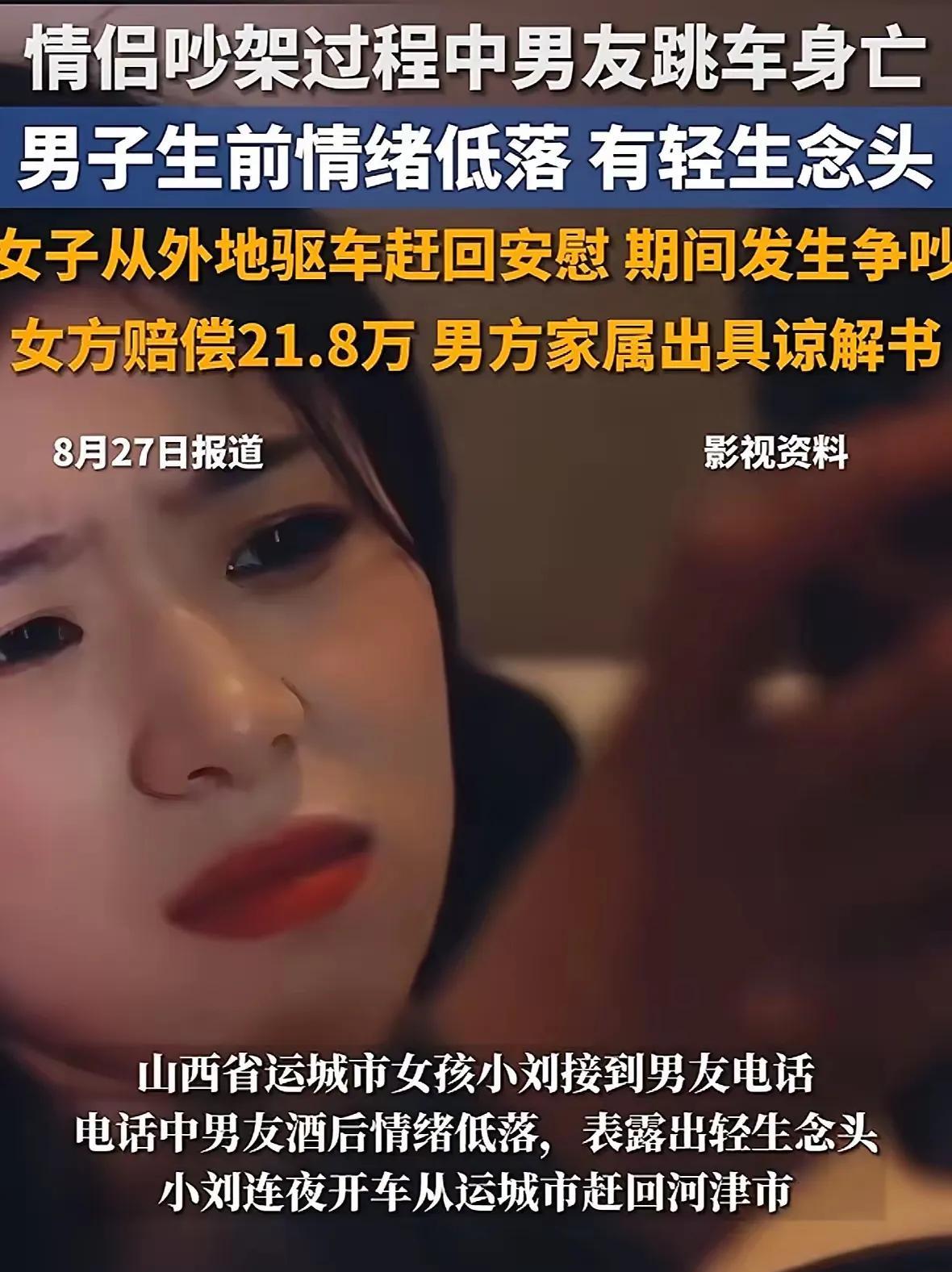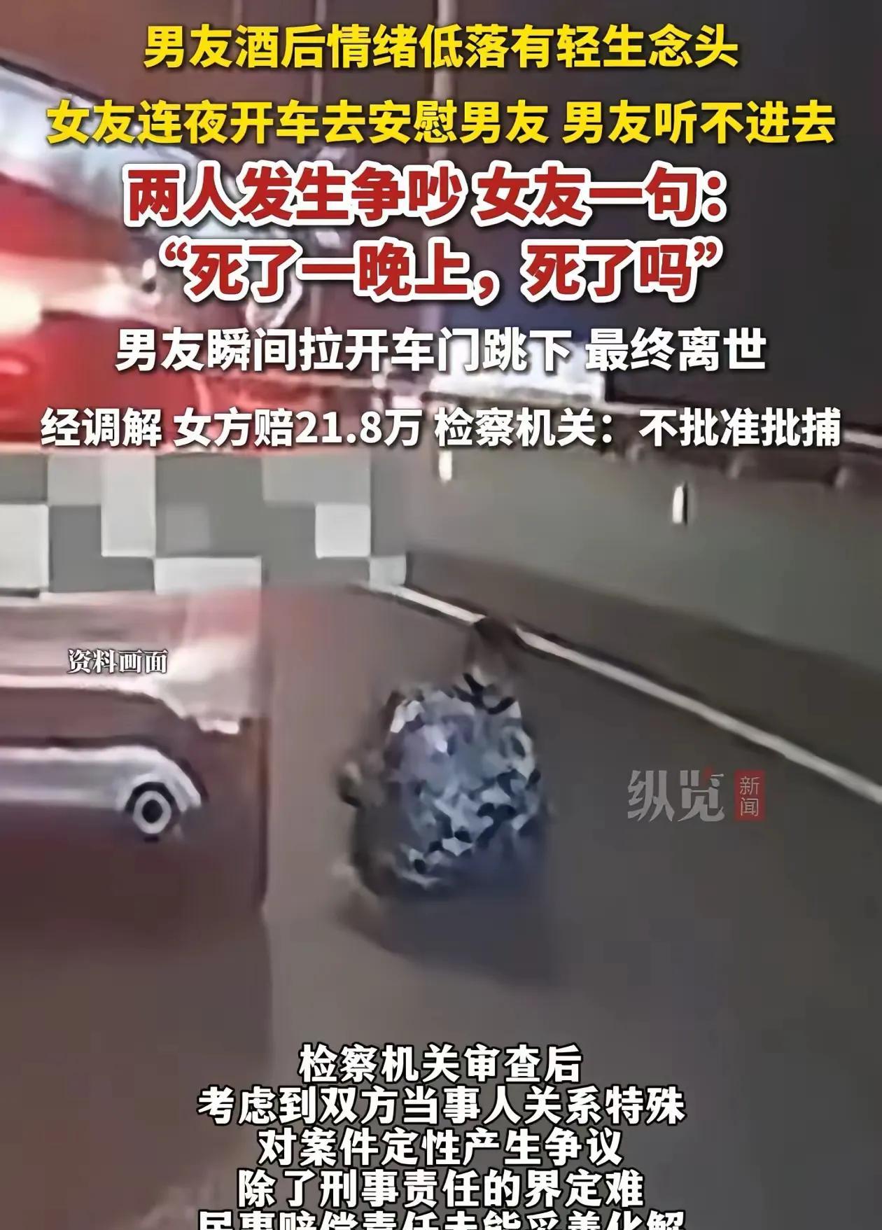 万万想不到!这下真的是比窦娥还冤了,女子连夜驱车安慰情绪低落的男友,结果仅因为说错一句话导致自己赔偿21.8万。 俗话说“百年修得同船渡,千年修得共枕眠”。 可在2024年4月的山西,一场本该充满暖意的“深夜奔赴”,却因为一句气话变成了两家人的悲剧。 那天晚上,运城的一名女子突然接到了远在河津市男友的电话。 电话里,男友情绪低落到了极点,还隐隐透露出想轻生的念头。 女子一听就慌了,心里急得不行,生怕男友真的做出傻事。 她没多想,哪怕知道连夜开车辛苦,哪怕要跑100多公里的路,还是赶紧收拾东西上了车——她满脑子就一个念头:快点到男友身边,把他劝住。 可谁也没料到,见面后的沟通不仅没抚平男友的情绪,反而让矛盾越闹越大。 两人坐在车里,女子耐着性子劝了好半天,说尽了软话,可男友根本听不进去,情绪反而越来越激动。 一开始还只是低声争执,到后来声音越来越大,女子也渐渐没了耐心——她本来就因为连夜开车又累又躁,看着男友油盐不进的样子,急火攻心下没管住嘴,说了句“死了一晚上死了吗?” 男友听完瞬间失控,一把拉开车门就跳了下去。 女子当时就懵了,赶紧下车救人,可一切都晚了。 男友被送到医院后,医生拼尽全力抢救了一周,最后还是没能留住他的命。 好好的一个人,就因为一场争吵、一句气话,没了。 事情发生后,当地派出所很快就介入了。 民警调查后认为,女子的那句话可能和男友的死亡有关,涉嫌过失致人死亡罪,不仅立了案,还向检察院提请批准逮捕。 这一下,女子彻底慌了——她本来是好心去劝人,怎么就变成“犯罪”了? 一边是失去男友的痛苦,一边是可能要坐牢的恐慌,那段时间她几乎崩溃。 好在检察院在审查的时候,注意到了这起案子的特殊性。 办案的人发现,女子和男友感情一直不错,不是那种有深仇大恨的关系,这场悲剧说到底是双方一时冲动造成的,不是故意为之。 综治中心接了这事之后,专门组了个专班,开了好几次会梳理细节,一会儿琢磨怎么跟女方沟通,一会儿又要安抚男方家属的情绪,就怕两边谈不拢。 好在经过一轮又一轮的协商,双方终于达成了一致:女子给男方家属赔偿21.8万元,男方家属收到钱后,出具了一份谅解书,不再追究女子的责任。 之后,检察院结合调解结果和案件的实际情况,认为女子虽然有言语过失,但情节很轻微,够不上犯罪,最终决定不批准逮捕。 一场差点闹到法院的刑事纠纷,就这么以“赔偿和解”的方式结了尾。 可这事传到网上后,议论声就没断过。 有旁观者忍不住替女子抱屈:“她都做到这份上了,大半夜开那么远的车去劝人,就算最后说了句气话,也不是故意的啊?” 也有网友说:“虽然觉得她冤,但法律上这么处理也合理,毕竟那句话确实刺激到了人。就是可惜了,她本来是好心,最后却要掏二十多万,希望她能早点从这事里走出来。” 说实话,这21.8万赔得让不少人觉得冤枉——她既没推搡男友,也没主动教唆他跳车,只是急火攻心说了句气话,最后却要为对方的冲动行为承担经济责任。 可反过来想,这事也给所有人提了个醒:不管是情侣还是夫妻,关系再近,说话也要有分寸。 尤其是在气头上,那些没经过脑子的话,很可能会变成刺向对方的刀。 谁能想到,一句随口的气话,会让一场深夜的“安慰之旅”,最终变成了要靠钱来收场的悲剧呢? 今天的分享到这里就结束了,大家对此事有何看法,欢迎在评论区留言和讨论,感兴趣的可以点击头像加关注,我将每日更新优质内容,我们下期见。 信源: 原文登载于潇湘晨报·晨视频2025年08月28日关于《情侣争吵中一句气话,男友跳车身亡,经调解后女子赔偿21.8万》的报道