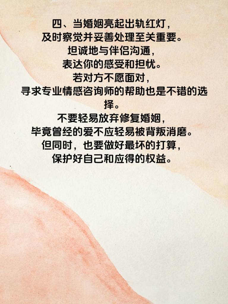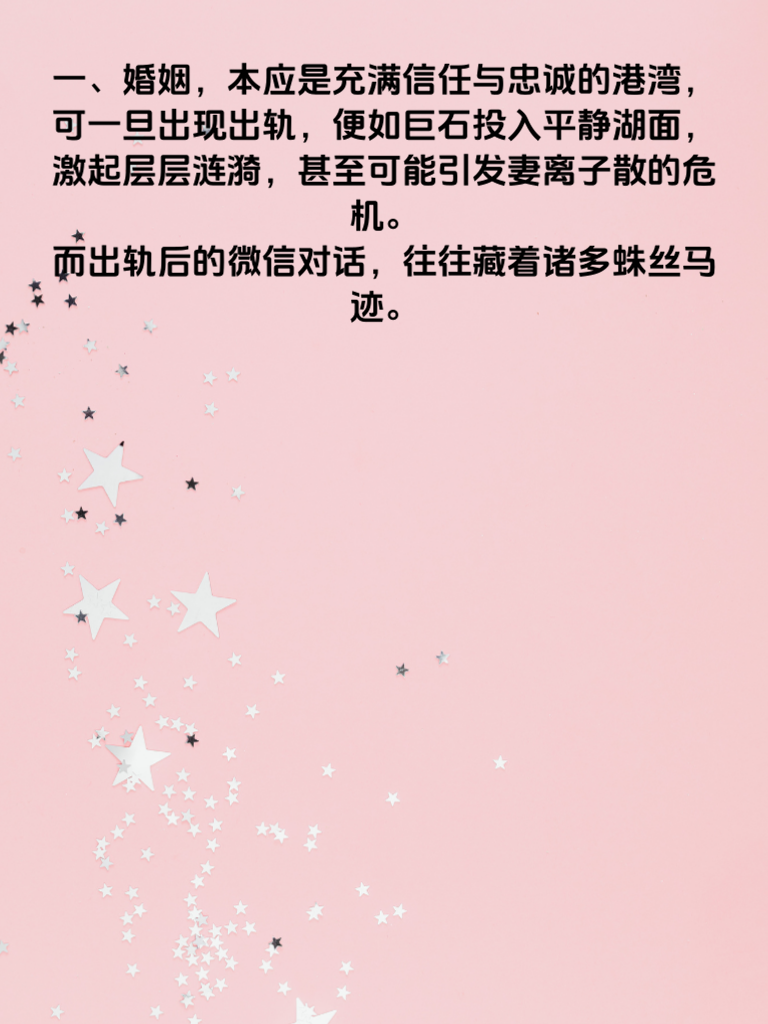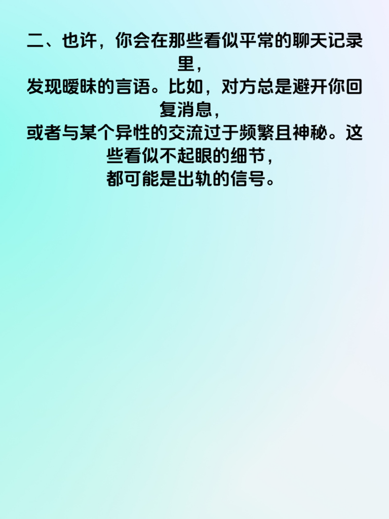 一、婚姻,本应是充满信任与忠诚的港湾,可一旦出现出轨,便如巨石投入平静湖面,激起层层涟漪,甚至可能引发妻离子散的危机。而出轨后的微信对话,往往藏着诸多蛛丝马迹。 二、也许,你会在那些看似平常的聊天记录里,发现暧昧的言语。比如,对方总是避开你回复消息,或者与某个异性的交流过于频繁且神 秘。这些看似不起眼的细节,都可能是出轨的信号。 三、再者,若你发现伴侣突然对手机格外在意,总是小心翼翼地拿着,甚至洗澡、睡觉都不离身,那也要警惕了。这很可能是他们在通过微信与出轨对象保持联系。 四、当婚姻亮起出轨红灯,及时察觉并妥善处理至关重要。坦诚地与伴侣沟通,表达你的感受和担忧。若对方不愿面对,寻求专业情感咨询师的帮助也是不错的选择。不要轻易放弃修复婚姻,毕竟曾经的爱不应轻易被背叛消磨。但同时,也要做好最坏的打算,保护好自己和应得的权益。