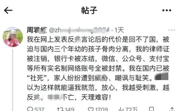 深圳女律师非常嚣张放出豪言——“中国越制裁我,我就越反华!” 今年百万粉丝女网红周君红在国外放出这句话,话音刚落,她的日子就更“热闹”了——出入境被管控,全家受影响,可她偏说要变本加厉。 周君红不是普通网红,曾经是深圳有名的律师。2013年拿律师资格证,先后在广东深亚太、华商、恒港等律所执业,专办刑事案件。最“出名”的是帮贩卖四百公斤毒品的当事人辩出“重大立功”,最终轻判。这种钻法律空子的本事,当时让她在律师圈颇有名气,日子过得顺风顺水。可2020年她突然辞职,转身去了国外。到了境外就像换了个人,在Twitter上天天转发“新疆强迫劳动”假新闻,配合西方媒体炒作涉jiang话题,还参与境外反华组织策划的“人权报告”,编造“看守所酷刑”“律师遭秘密逮捕”等谣言。 作为律师,她该懂法。她的出入境管控,不是“制裁”,是违法后的必然后果。再说她的反常行为,境外势力哪是真帮她?不过是把她当“工具人”——给点小钱,让她发点谣言,用完了随时能扔。她以为美国能庇护她,可美国的“自由”是有代价的:她的Twitter账号早就被平台标记为“虚假信息来源”,粉丝里一半是机器人,评论区骂她“背叛者”的占了八成。还有她的家庭,据说婚内出轨被丈夫断绝关系,孩子也不愿联系她,她不反思自己的问题,反而把反华当“救命稻草”,以为骂国家就能博同情,可谁会信一个背叛家乡的人? 周君红为什么放着好好的律师工作不干,非要走反华这条路? ① 私欲膨胀。她做律师时就钻法律空子,帮贩毒犯轻判的“战绩”,让她觉得“只要能出名,什么都能做”。到了国外,反华是最快的“流量密码”,她想靠这个赚更多钱,博更大名气,哪怕底线都不要;② 受境外势力迷惑。那些人用“自由”“民主”的虚话骗她,给点小恩小惠——比如帮她租房子,给她点零花钱,她就信了,忘了自己是中国人,忘了父母是怎么把她养大的;③ 逃避现实。家庭破裂后,她找不到生活的方向,反华成了她的“精神鸦片”,骂国家能让她暂时忘了自己的失败,可越骂越陷越深,把自己困在“自嗨”的陷阱里。 周君红的悲剧,在于“忘本”。她忘了自己是中国人,忘了律师的职责是维护法律正义,不是钻空子;忘了国家稳定是家庭幸福的基础——就像网友说的,“要是国家破了,还会有家吗?”她以为反华能让自己“高人一等”,可实际上,她是在毁自己的未来:律师证可能被吊销,出入境被管控,孩子不愿见她,境外势力用完就扔。老百姓最在意的,是平平安安的日子,她的反华行为,破坏的就是这种平安——比如她编造的“看守所酷刑”谣言,会让不明真相的人对国家失去信任,进而影响社会稳定。而社会不稳定,受伤的是普通老百姓:生意做不成,孩子上学不安全,这些都是老百姓最头疼的事,她却把这些当“儿戏”,只为了自己那点可怜的“流量”。 没有国家的稳定,哪有她做律师时的风光,哪有她在国外“自在”上网的机会?她骂国家的时候,忘了自己的一切都是国家给的:学法律的机会,做律师的平台,甚至她父母的生活,都是国家稳定带来的。 我觉得周君红的问题,根源是“丢了魂”。她曾经是律师,懂法却犯法;曾经有家庭,懂爱却背叛。她以为反华能让自己“风光”,可实际上,她是在把自己往火坑里推。就算境外势力给她点好处,那也是暂时的,等她没用了,谁会管她?她的结局,只会是“众叛亲离”——境外势力扔了她,家人忘了她,网友骂她,连她自己都不敢面对自己的良心。 你觉得她还有回头的机会吗?