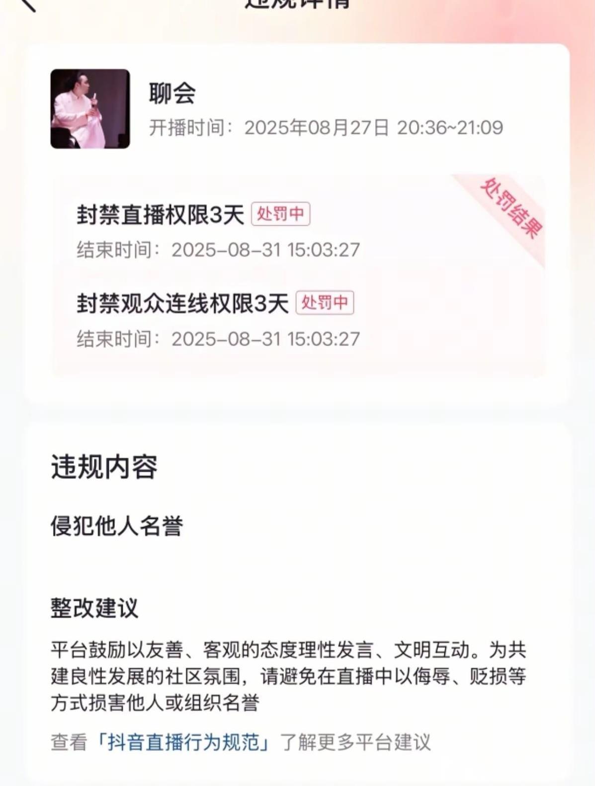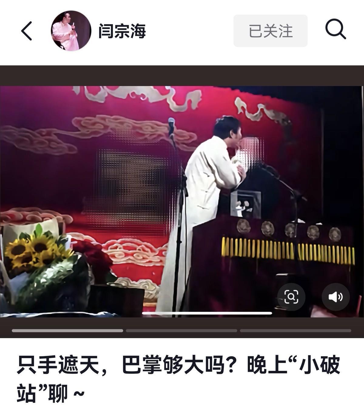 #秋日生活打卡季# 闫宗海,接连爆料,导致直播间被放假。 闫宗海,原来是郭德纲的大徒弟,艺名闫云达。 郭德纲和闫云达,也曾经师徒情深:久别重逢之后,郭德纲不但让闫云达担任二队队长,还给他办了两场商演。 可惜的是,这段师徒情,到2018年,就戛然而止了:闫云达突然退出德云社,恢复本名闫宗海。 最近这段时间,闫宗海一直在砸缸。 前天晚上,闫宗海隔空喊话前师娘王惠,爆料郭德纲关注了不少艺校女生。 昨天晚上,闫宗海又爆料郭德纲关注的人数从741突然降到了138。 刚刚刷到闫宗海的视频,标题为:《只手遮天,巴掌够大吗?晚上小破站聊》。 视频很简单,只有三张图片。 第一张图片,是闫宗海和前师父同台的照片;第二张图片是AI制作的;第三张是处罚单。 因为连续爆料,闫宗海的直播间被放假三天,闫宗海只能另想它法。 闫宗海现在是一条道走到黑,接下来他肯定还会继续爆料。 我总觉得,闫宗海应该适可而止,毕竟师徒一场,毕竟胳膊拧不过大腿,没必要继续砸缸。