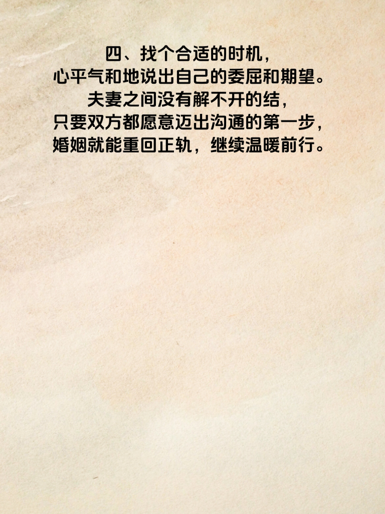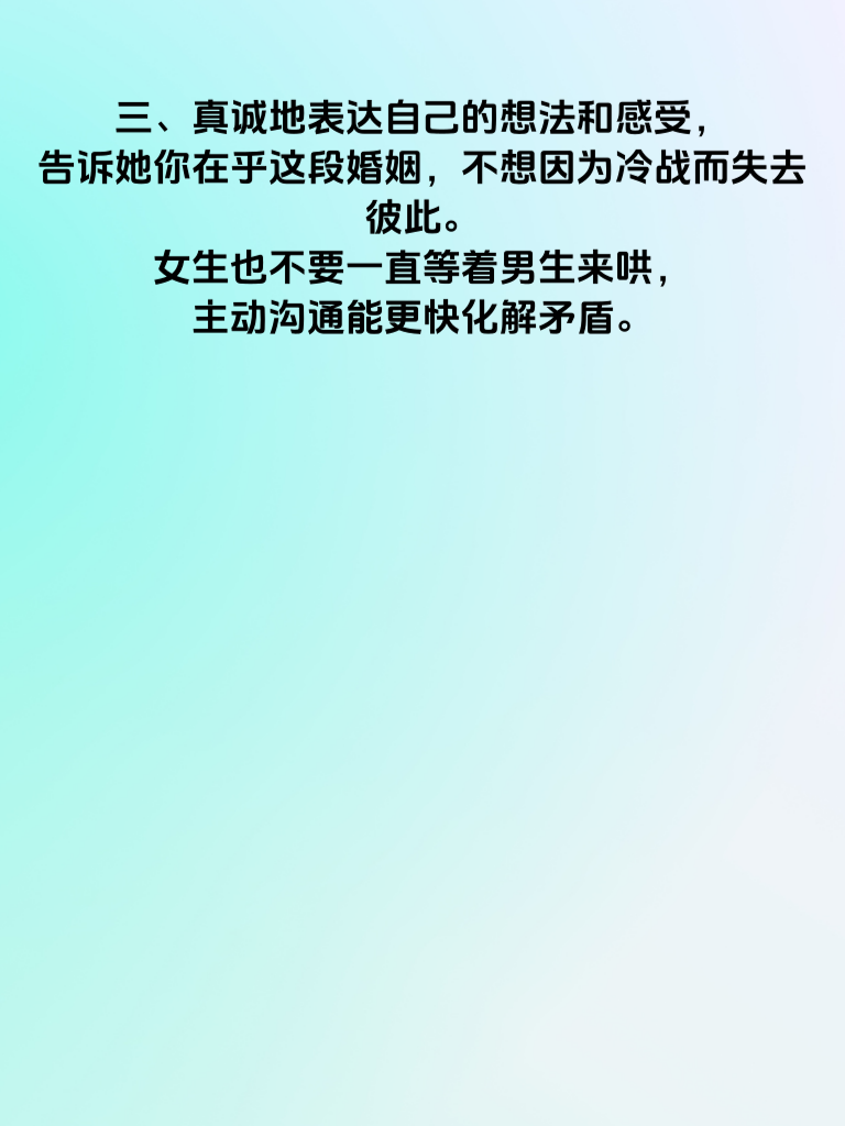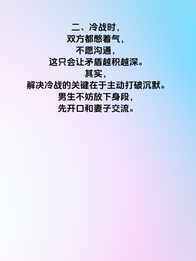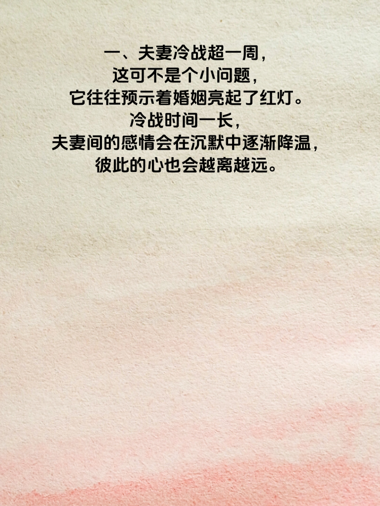 一、夫妻冷战超一周,这可不是个小问题,它往往预示着婚姻亮起了红灯。冷战时间一长,夫妻间的感情会在沉默中逐渐降温,彼此的心也会越离越远。 \ 二、冷战时,双方都憋着气,不愿沟通,这只会让矛盾越积越深。其实,解决冷战的关键在于主动打破沉默。男生不妨放下身段,先开口和妻子交流。 三、真诚地表达自己的想法和感受,告诉她你在乎这段婚姻,不想因为冷战而失去彼此。女生也不要一直等着男生来哄,主动沟通能更快化解矛盾。 四、找个合适的时机,心平气和地说出自己的委屈和期望。夫妻之间没有解不开的结,只要双方都愿意迈出沟通的第一步,婚姻就能重回正轨,继续温暖前行。
