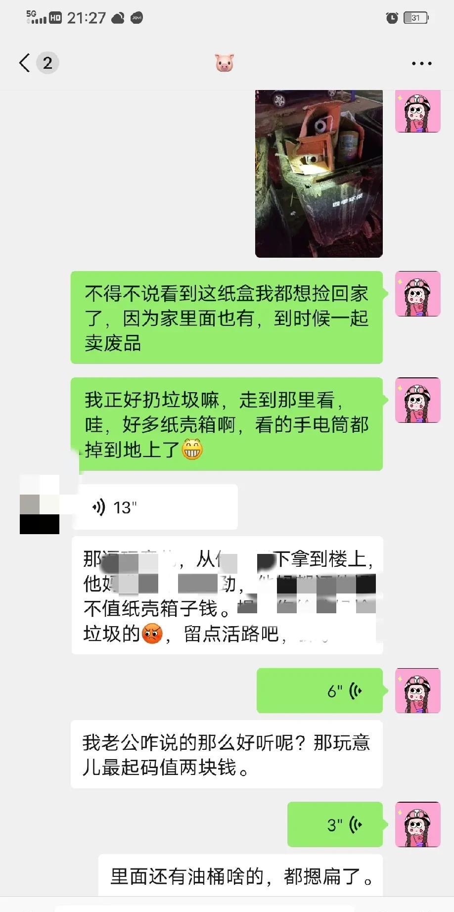 晚上9:30下来接高二的孩子,顺便把家里的垃圾拿下楼扔,看到这垃圾桶里面的纸盒箱,看的眼都发亮了,此刻手上拿着手电筒都掉到地上了,思来想去,真的想把这些纸盒箱捡回家,而且纸盒箱里面还装有两个大油桶摁扁了的,这一堆至少也能卖2块钱吧!够买一餐蔬菜的钱了,主要因为家里平时拆的快递纸盒箱都留着卖废品,我把这一幕发给老公看了,老公直言,你还是给捡废品的人留个活路吧![呲牙],于是我决定不拾上楼了,看看这一大堆纸盒箱明天早上谁运气好能捡到!