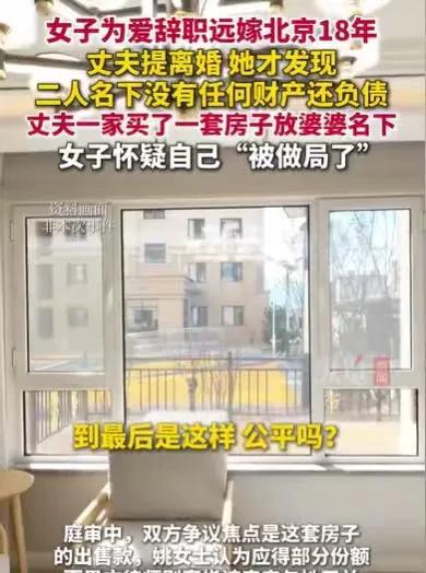 北京,女子为爱,不惜辞职远嫁,18年了,她卖掉他们住的房子,帮助丈夫度过难关,后来丈夫又买了一套房,却提出离婚,女子这才发现,丈夫买的这套房是登记在婆婆名下,他们两人的名下没有任何财产,还负债,女子突然醒悟,才知道自己被丈夫和婆家欺负了。 8月28日纵览新闻报道,18年了,姚女士想起自己的这18年,她满心的心酸,她为丈夫付出18年的爱,为婆家付出18年的奉献,最后得到的,却是被离婚的结局。 她回想起这18年,她不知道自己到底哪点做错了,丈夫和婆家要如此对她。 就在18年前,她和当时英俊潇洒的丈夫相识,两人初相识,一切是那么的美好,一切又是那么的浪漫,那时的丈夫,一脸的阳光,帅气逼人,让她一眼爱上。 当年的她有一份不错的工作,她在单位前途无量,那时她正芳华,魅力与能力并存。 可为了能够和丈夫在一起,她不顾大家的疑惑, 坚决辞职,来到了婆家。 从浙江到北京,她远嫁,好在丈夫家条件不错,在北京,也是一个充满机会的地方,她决定跟着丈夫在这片土地上奋斗。 结婚之后,她一心一意,只想着和丈夫过上红红火火的日子,她非常支持丈夫的事业。 丈夫的事业看起来风光,实际上,千疮百孔,在这18年里,姚女士不止一次帮助丈夫,甚至在丈夫最难的时候,她愿意卖掉他们唯一的房子,填补丈夫公司的窟窿。 在姚女士的帮助下,丈夫的事业才慢慢有了起色,后来丈夫又买了一套房,姚女士才有了房子住。 可就是这一套房,让姚女士看清了丈夫和婆家的真面目。 就在姚女士和丈夫风风雨雨走过了18年,姚女士还时时刻刻准备着和丈夫白头偕老,丈夫却突然有一天提离婚了,并且态度很坚决,没有挽回的余地。 姚女士看着陌生的丈夫,她不知道,丈夫为何在婚后的18年,要如此坚决地和她离婚。 难道丈夫忘记了,18年前,姚女士是为了爱,才辞掉了前途无量的工作,也是为了爱,不惜远嫁。 就算丈夫忘记了18年前的事情,丈夫也不应该忘记这18年来的相互扶持,没有她的帮忙,就没有丈夫的今天。 但无论姚女士如何执着,如何想知道一个结果,丈夫始终没有给出一个理由,反正丈夫就是要离婚。 姚女士看着丈夫的坚决,她也不再执着,18年了,她也应该回到父母身边孝敬父母了,这18年来,她一心只替丈夫尽孝道,而她自己的孝道却没有尽。 既然丈夫决心已决,这段感情也没必要维持了。 可直到这一刻,她才知道自己18年来的辛苦付出,她和丈夫却没有一丁点的共同财产,有的只是共同的债务。 让姚女士想不通的事,明明丈夫买了一套房,为何就没有共同财产了。 也就是在这时,她才知道,丈夫买的这套房是登记在婆婆名下的,和她没有半点关系。 姚女士为自己的付出感到很不值,她觉得这套房子出售之后,应该有她应得的份额,于是她起诉了丈夫。 那么如何看待姚女士的事情呢? 首先,姚女士一心一意为丈夫,一心一意为婆家付出,丈夫和婆家却处心积虑,他们把房子登记在婆婆名下,隐瞒事实,这是非常不利于家风建设的。 《民法典》第1043条规定:家庭应当树立优良家风,弘扬家庭美德,重视家庭文明建设。夫妻应当互相忠实,互相尊重,互相关爱;家庭成员间应当敬老爱幼,互相帮助,维护平等、和睦、文明的婚姻家庭关系。 也许从买房子登记在婆婆名下的那一刻其,丈夫就已经打算着要和姚女士离婚,让姚女士净身出户了。 其次,如果姚女士的丈夫用的是夫妻之间的共同财产买房子,那么登记在婆婆名下的这套房子,杨女士可以追回。 《民法典》第1062条规定:夫妻在婚姻关系存续期间所得的下列财产,为夫妻的共同财产,归夫妻共同所有: (一)工资、奖金、劳务报酬; (二)生产、经营、投资的收益; (三)知识产权的收益; (四)继承或者受赠的财产,但是本法第一千零六十三条第三项规定的除外; (五)其他应当归共同所有的财产。 夫妻对共同财产,有平等的处理权。 毕竟这是她和丈夫之间的夫妻共同财产,姚女士有平等的处理权。 18年的付出,结局却是净身出户,确实不值得。 那么你对姚女士的事情有何看法呢?#头号创作者激励计划#