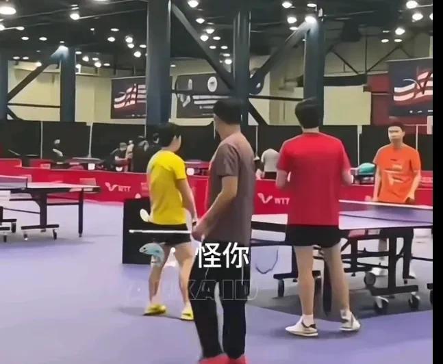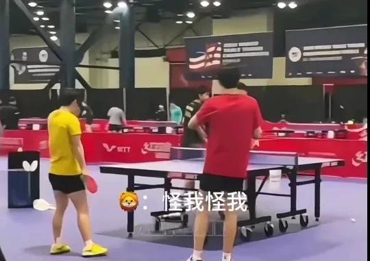 原来这就是番茄炒蛋名场面!莎莎和头和在练习混双。莎莎穿着黄色T恤,头哥穿着红色T恤。莎莎捡了个球一转身直接撞在头哥身上。头哥:我要不是站在这儿你就直接撞过来了。莎莎:怪你!头哥:怪我怪我!哈哈!莎莎的坏脾气果然都是你惯的!