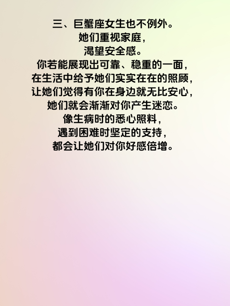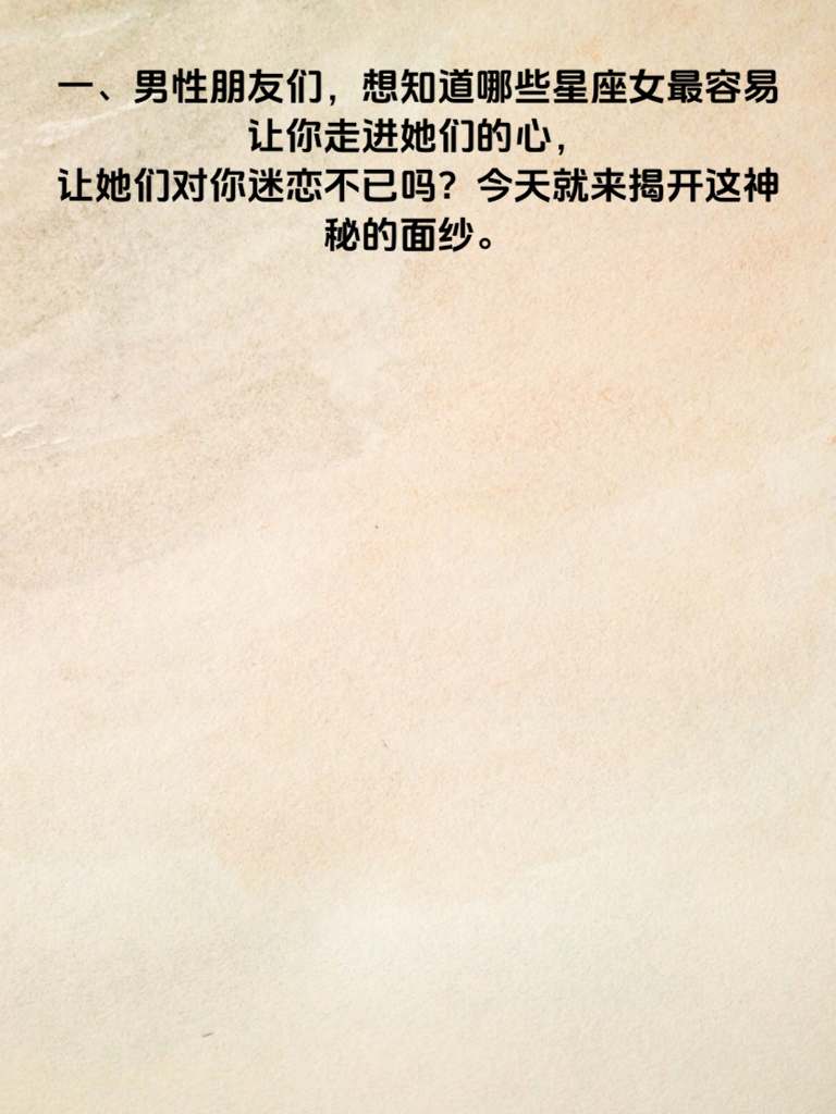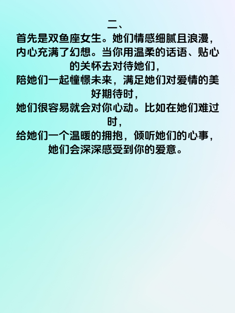 一、男性朋友们,想知道哪些星座女最容易让你走进她们的心,让她们对你迷恋不已吗?今天就来揭开这神秘的面纱。 二、首先是双鱼座女生。她们情感细腻且浪漫,内心充满了幻想。当你用温柔的话语、贴心的关怀去对待她们,陪她们一起憧憬未来,满足她们对爱情的美好期待时,她们很容易就会对你心动。比如在她们难过时,给她们一个温暖的拥抱,倾听她们的心事,她们会深深感受到你的爱意。 三、巨蟹座女生也不例外。她们重视家庭,渴望安全感。你若能展现出可靠、稳重的一面,在生活中给予她们实实在在的照顾,让她们觉得有你在身边就无比安心,她们就会渐渐对你产生迷恋。像生病时的悉心照料,遇到困难时坚定的支持,都会让她们对你好感倍增。 四、最后是天秤座女生。她们追求平衡与和谐,注重外表与内在的契合。你要有良好的形象气质,同时具备风趣幽默的性格,能和她们愉快地交流,分享生活中的点滴。当你们相处融洽,彼此欣赏,她们就很可能陷入对你的迷恋之中。