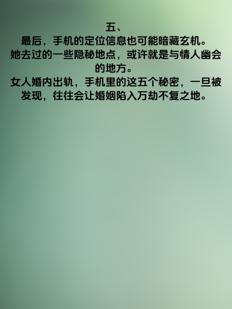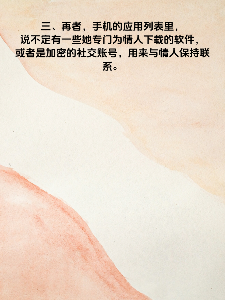 一、婚内出轨,是婚姻中一道难以愈合的伤口。而女人手机里往往藏着诸多秘密。其中,聊天记录可能是她出轨的关键线索。那些与情人暧昧的言语,小心翼翼避开家人的对话,都可能藏在手机的某个角落。 二、相册也是不容忽视的地方。也许有她和情人的合照,或者是记录着他们相处点滴的照片。这些看似平常的图片,却可能是她背叛婚姻的铁证。 三、再者,手机的应用列表里,说不定有一些她专门为情人下载的软件,或者是加密的社交账号,用来与情人保持联系。 四、还有通话记录,频繁与同一个号码的通话,时长较长且避开家人的通话,都可能指向她婚内出轨的事实。 五、最后,手机的定位信息也可能暗藏玄机。她去过的一些隐秘地点,或许就是与情人幽会的地方。女人婚内出轨,手机里的这五个秘密,一旦被发现,往往会让婚姻陷入万劫不复之地。