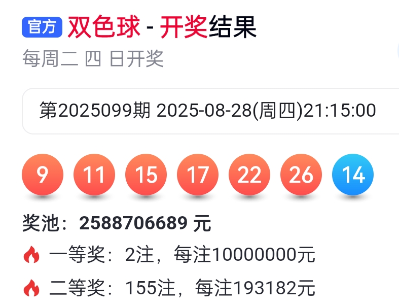 恭喜5+1,不是二等奖,是三等奖! 双色球25099期开奖结果,红球开出9.11.15.17.22.26,蓝码开出14。从三分区走势来看,区间比Wie2:3:1,大小比为2:4,奇偶比为4:2。一码重号17。一区开出2码,龙头9属于斜连号走势,11间隔11期回补。二区开出3码,15间隔3期回补,17属于重号回补,22间隔3期回落。三区开出1码,凤尾26又是间隔1期回补,蓝码开出14。#双色球开奖结果# 本期一等奖全开出2注,单注奖金1000万元,喜落江苏和河南。二等奖开出155注,单注奖金19万元。