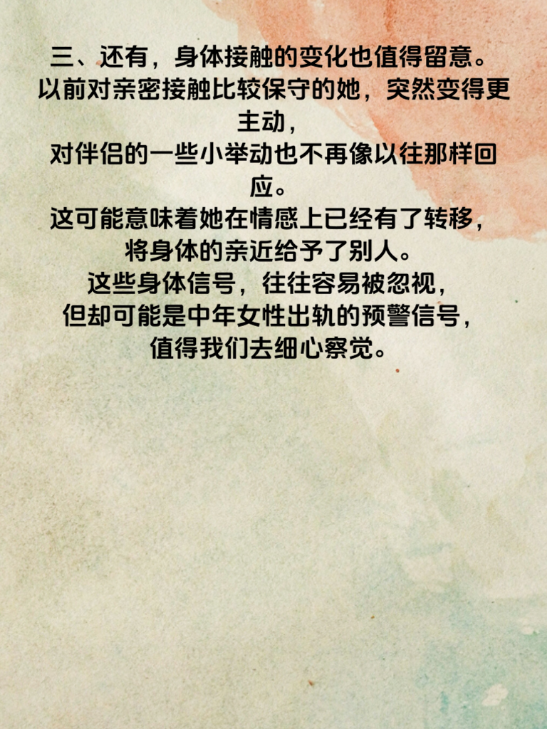 一、中年女性出轨,身体信号往往暗藏玄机。当她们开始注重外表,频繁购买新衣服、精心打扮,或许不仅仅是为了取悦自己。这种对外表的过度关注,有可能是因为心中有了新的期待,渴望在他人面前展现更好的自己。 二、再者,日常的作息变得不规律。原本早睡早起的她,开始频繁熬夜,或者早起外出。这种作息的改变,背后可能隐藏着与他人相处的时间安排。也许她在偷偷与另一个人共享夜晚的时光,或者清晨去赴一场秘密约会。 三、还有,身体接触的变化也值得留意。以前对亲密接触比较保守的她,突然变得更主动,对伴侣的一些小举动也不再像以往那样回应。这可能意味着她在情感上已经有了转移,将身体的亲近给予了别人。这些身体信号,往往容易被忽视,但却可能是中年女性出轨的预警信号,值得我们去细心察觉。