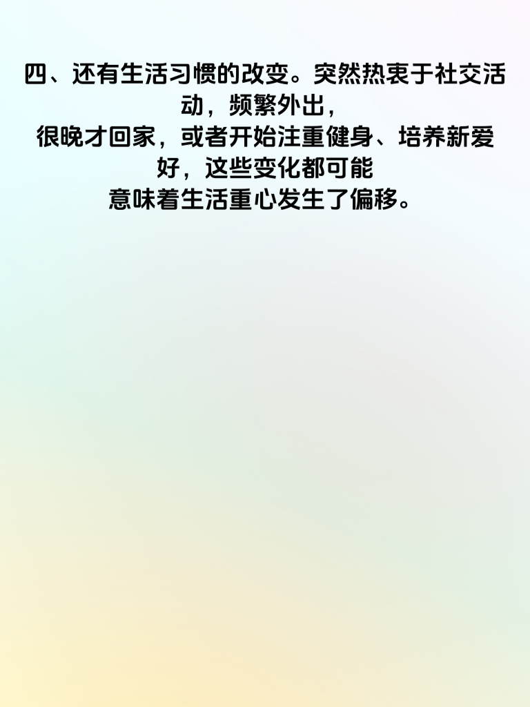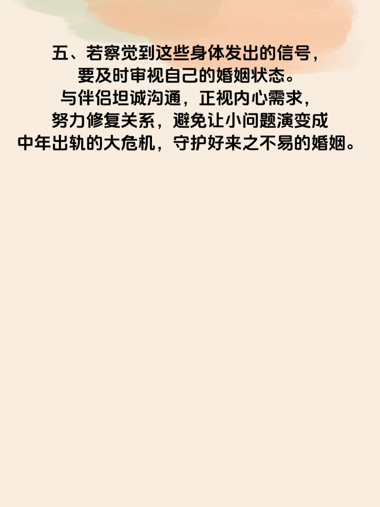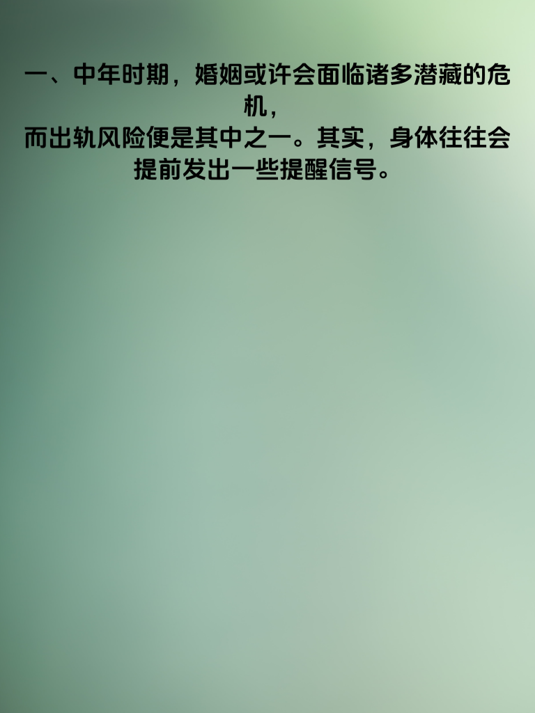 一、中年时期,婚姻或许会面临诸多潜藏的危机,而出轨风险便是其中之一。其实,身体往往会提前发出一些提醒信号。 二、首先,在情绪方面可能会出现较大波动。平时温和的人,突然变得易怒烦躁,或者莫名地情绪低落、焦虑不安,这可能是内心对现状有所不满的一种反映。 三、再者,身体的注意力也会转移。比如原本关注家庭和伴侣,现在却开始更多地在意自己的外表、穿着,对自身形象有了不一样的重视,这可能暗示着内心有了新的期待。 四、还有生活习惯的改变。突然热衷于社交活动,频繁外出,很晚才回家,或者开始注重健身、培养新爱好,这些变化都可能意味着生活重心发生了偏移。 五、若察觉到这些身体发出的信号,要及时审视自己的婚姻状态。与伴侣坦诚沟通,正视内心需求,努力修复关系,避免让小问题演变成中年出轨的大危机,守护好来之不易的婚姻。