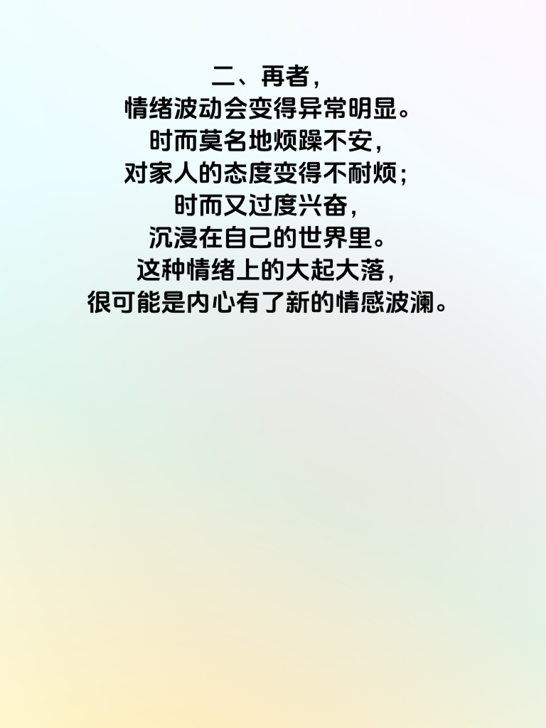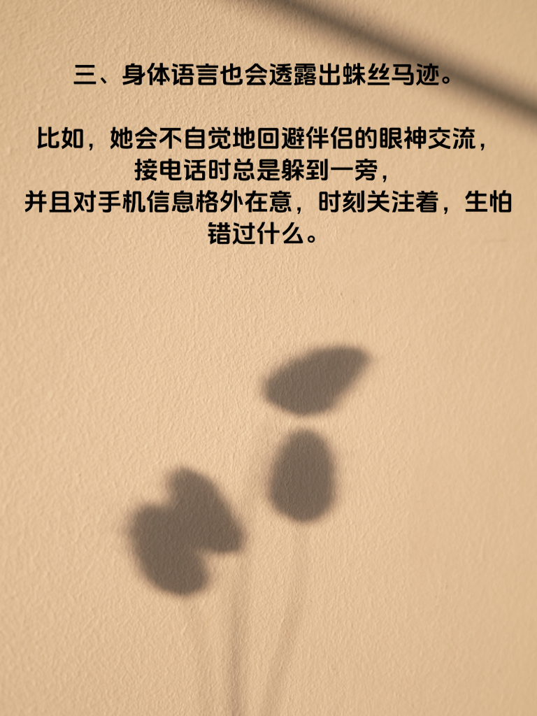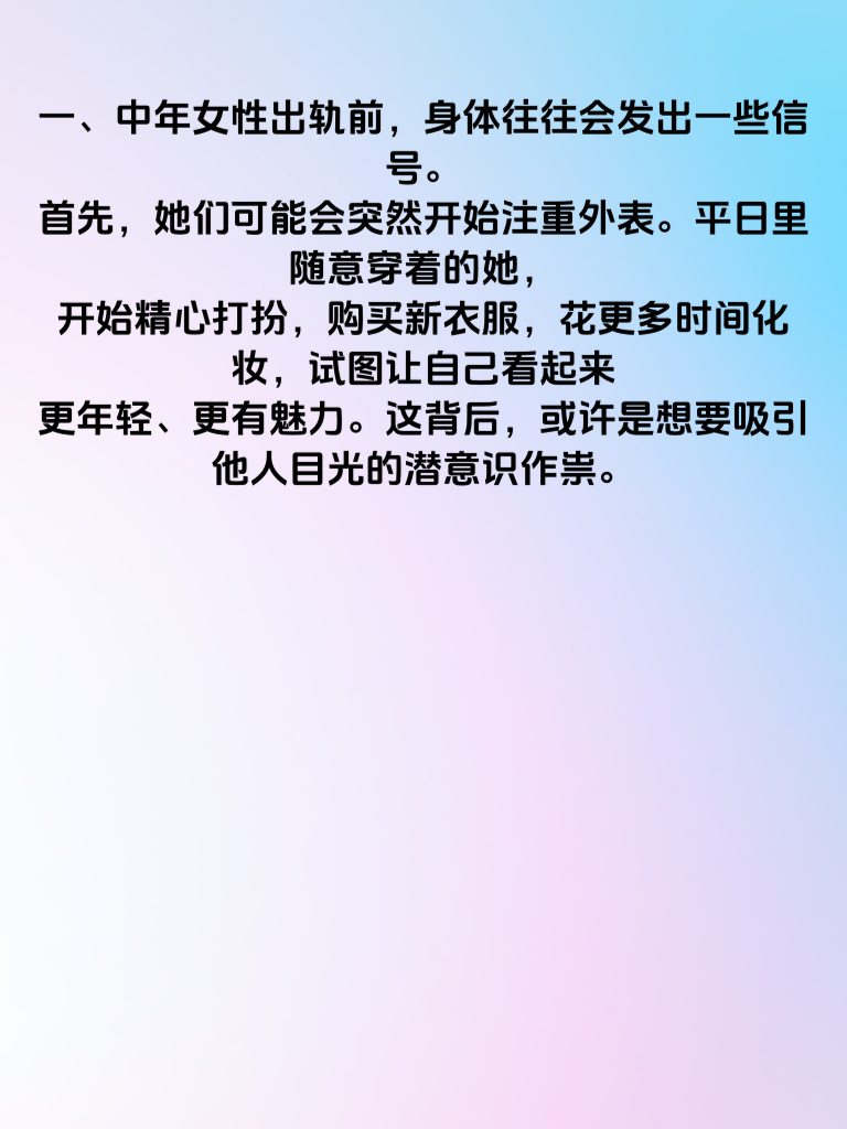 一、中年女性出轨前,身体往往会发出一些信号。首先,她们可能会突然开始注重外表。平日里随意穿着的她,开始精心打扮,购买新衣服,花更多时间化妆,试图让自己看起来更年轻、更有魅力。这背后,或许是想要吸引他人目光的潜意识作祟。 二、再者,情绪波动会变得异常明显。时而莫名地烦躁不安,对家人的态度变得不耐烦;时而又过度兴奋,沉浸在自己的世界里。这种情绪上的大起大落,很可能是内心有了新的情感波澜。 三、身体语言也会透露出蛛丝马迹。比如,她会不自觉地回避伴侣的眼神交流,接电话时总是躲到一旁,并且对手机信息格外在意,时刻关注着,生怕错过什么。 四、还有,生活习惯可能发生改变。原本规律的作息变得混乱,经常借口加班或应酬晚归。饮食习惯也可能改变,对某些食物的喜好突然变化,或者食量明显减少或增加。如果你发现身边的中年女性有这些迹象,就要多留意了,及时沟通或许能避免一些情感危机。