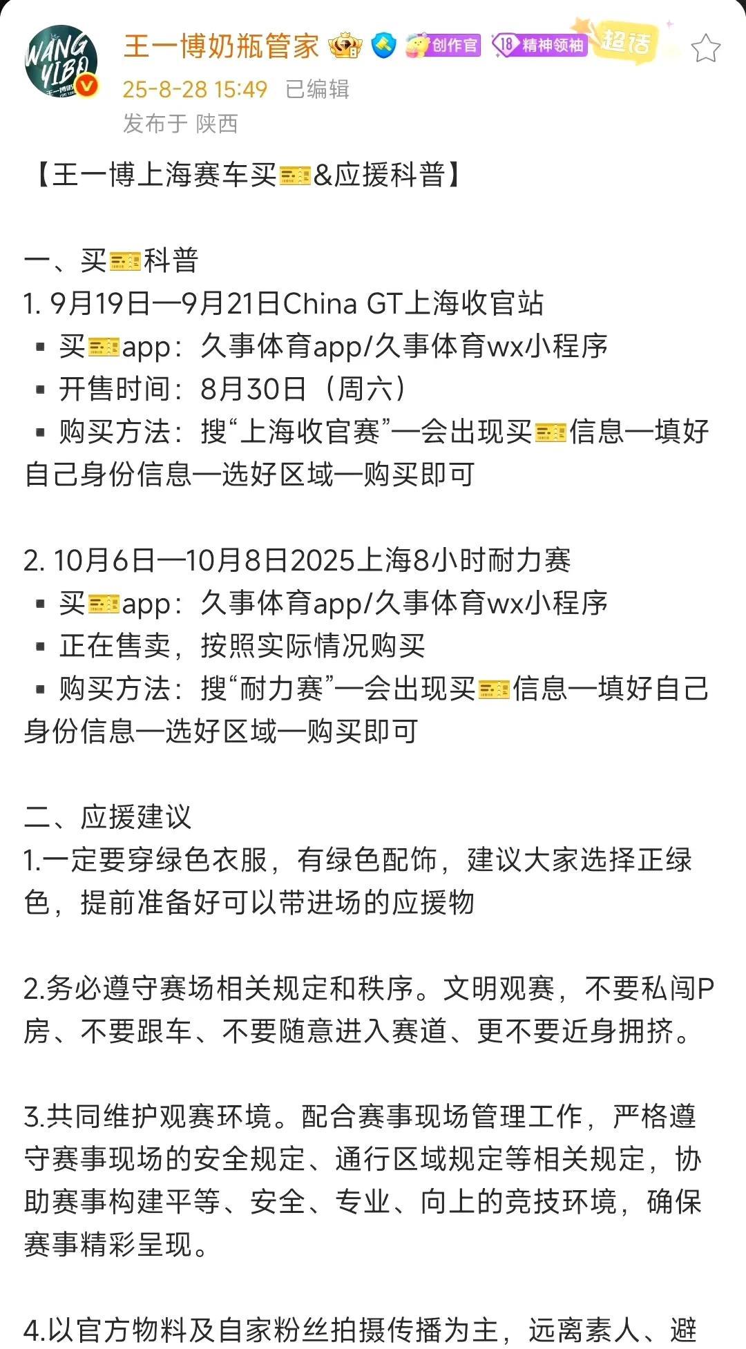 好贴心,想看王一博的赛车的姐妹看过来。 买票攻略来了,见图二,可以说是保姆级的。要收藏好哦。 要用绿色把自己打扮的漂漂亮亮的,去见王一博。 他们说了,要远离素人,只关注85号赛车手,我觉得有道理,来看王一博的,其他的都不重要。 这次赛车,一博不仅官宣的这么早,还提供了购票攻略,也太为粉丝着想了[比心][比心][比心]。幸福! #我的宝藏兴趣# #上海赛车王一博#