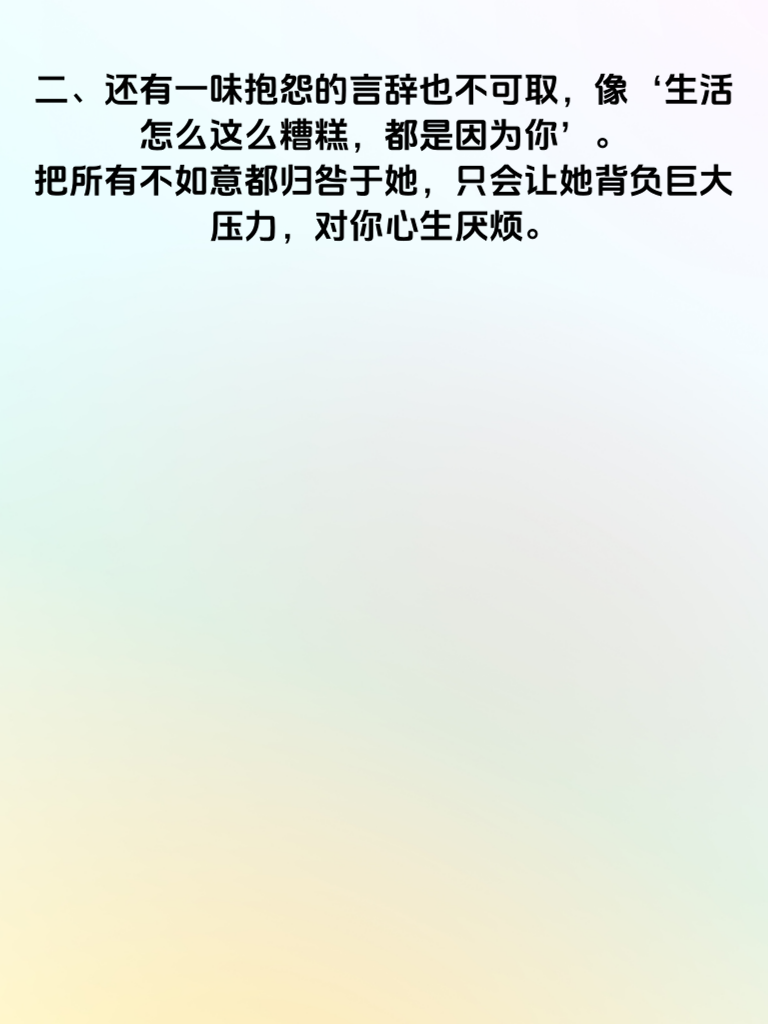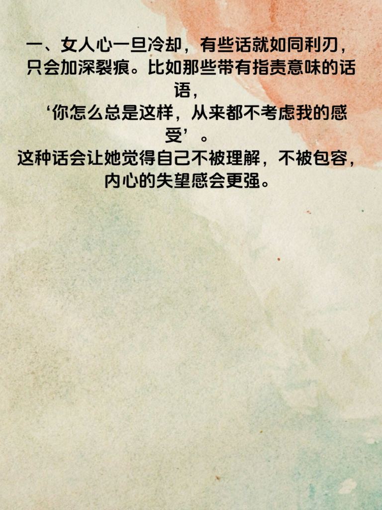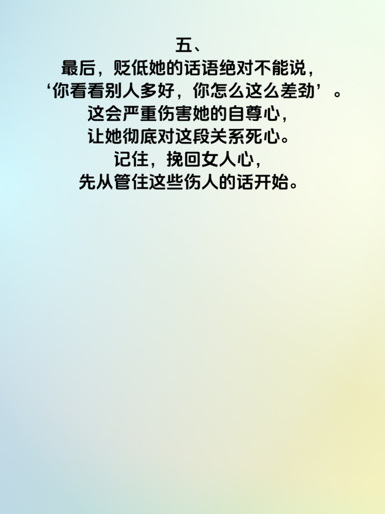 一、女人心一旦冷却,有些话就如同利刃,只会加深裂痕。比如那些带有指责意味的话语,‘你怎么总是这样,从来都不考虑我的感受’。这种话会让她觉得自己不被理解,不被包容,内心的失望感会更强。 二、还有一味抱怨的言辞也不可取,像‘生活怎么这么糟糕,都是因为你’。把所有不如意都归咎于她,只会让她背负巨大压力,对你心生厌烦。 三、再者,翻旧账的话千万别出口,‘你上次也是这样,根本没改’。不断提及过去的错误,会让她觉得自己一直被否定,看不到未来的希望。 四、当她心已失时,空洞的承诺如‘我以后会改的,相信我’,没有实际行动支撑,只会显得苍白无力。 五、最后,贬低她的话语绝对不能说,‘你看看别人多好,你怎么这么差劲’。这会严重伤害她的自尊心,让她彻底对这段关系死心。记住,挽回女人心,先从管住这些伤人的话开始。