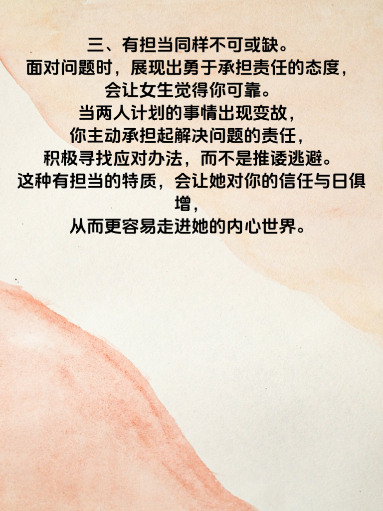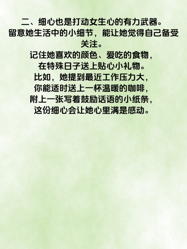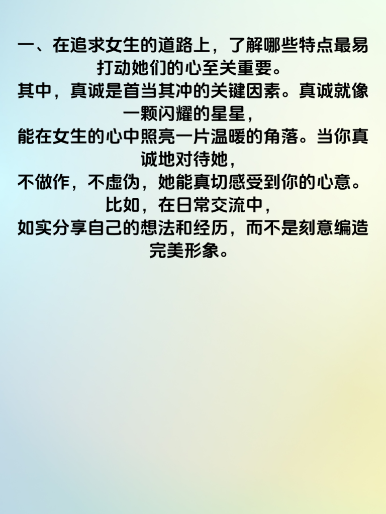 一、在追求女生的道路上,了解哪些特点最易打动她们的心至关重要。其中,真诚是首当其冲的关键因素。真诚就像一颗闪耀的星星,能在女生的心中照亮一片温暖的角落。当你真诚地对待她,不做作,不虚伪,她能真切感受到你的心意。比如,在日常交流中,如实分享自己的想法和经历,而不是刻意编造完美形象。 二、细心也是打动女生心的有力武器。留意她生活中的小细节,能让她觉得自己备受关注。记住她喜欢的颜色、爱吃的食物,在特殊日子送上贴心小礼物。比如,她提到最近工作压力大,你能适时送上一杯温暖的咖啡,附上一张写着鼓励话语的小纸条,这份细心会让她心里满是感动。 三、有担当同样不可或缺。面对问题时,展现出勇于承担责任的态度,会让女生觉得你可靠。当两人计划的事情出现变故,你主动承担起解决问题的责任,积极寻找应对办法,而不是推诿逃避。这种有担当的特质,会让她对你的信任与日俱增,从而更容易走进她的内心世界。