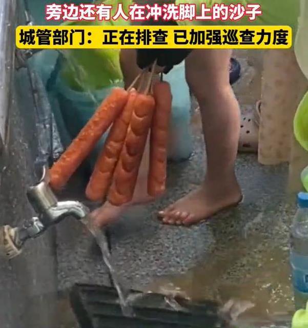 你们来洗脚吗?那我就来洗烤肠咯!在厦门一处沙滩景区,游客们在洗脚池边洗脚,这个时候,一位大妈端来了5根烤肠,也加入了“洗脚大军”,直接在水龙头处冲洗烤肠。 据star星视频8月26日报道称,有人居然在景区的洗脚池边,冲洗烤肠? 根据目击者称,当时的情况是这样的。 一位佩戴着太阳帽的大妈,开着一辆三轮电动车,自行行驶到厦门白城沙滩处。她准备在这个景点摆放烤肠摊位。 正在整理烧烤用具的时候,大妈不小心将一堆烤肠给弄掉了。于是,5根烤肠齐刷刷的就散落一地。 这下,烤肠外面可不是包裹着孜然粉了,而是包裹着“沙子粉”,烤肠上面沾满了沙子。 当时大妈想都没想,直接就把烤肠给捡了起来,装到黑色烤盘里,然后来到了游客洗脚区。她是准备将掉落的烤肠给扔掉吗? 实则不是,她是加入了洗脚大军,游客们在这边清洗着脚丫子,大妈则考虑在这边清洗她的烤肠。本来掉落的烤肠就引发人体不适了,这下居然还要跟着一群脚丫子一道清洗,实在是令人难以接受。 只见洗脚区,小朋友们都在不断蹦跶,溅出来的水滴、还有四处飞扬的尘沙,全都飞洒到大妈的烤肠上去了。 不仅如此,大妈清洗完自己的那五根烤肠之后,又开始清洗手里的烤盘、餐盘等。话说,在洗脚的地方,可以直接清洗食物?对于此等操作,实在是令人费解。 有网友将这一幕给拍了下来,直接就发布到网站上去。网友质疑称,一边是光脚大汉,一边是烤制过的不洁香肠,咱就想知道,这些烤肠是不是会重新售卖给消费者食用? 此事被爆料之后,一时间网友们均议论纷纷。记者也连线到厦门的有关部门,工作人员表示,会展开调查。 经过调查之后发现,这位清洗人员是景区的流动商贩,没有固定摊位,也没有登记在册。如今,循着网络视频线索,已经转接给当地的城管部门,但是目前还没有找到涉事人员。 城管部门相关工作人员指出,会对这件事展开调查,也会依法依规处置。后期会加大景点的日常巡逻、也会加大普法宣传,提醒游客们不要去购买不合格、不卫生的食品食用。 网友们也称,商贩是流动的,游客也是流动的,但是赚的钱却是保稳的。不能去贪赚黑心钱,今天这位顾客买了,明天再侥幸赚其他人的钱,食品不安全,这钱赚的谈何安稳呢。 而且,大家还指出,购买烤肠食用的几乎都是小孩子吧,这样一想,更加不能原谅了。 经营商家可以将烤肠拿到洗脚区清洗吗? 商家在处理食品的时候,必须要到专门的食品清理区域进行操作。随意将食品拿到洗脚区域清洁,其卫生环境堪忧,这个行为肯定是不合法的。 根据《食品安全法》规定,经营商家应该使用专门的食品清洗区域何符合卫生标准的水源进行食品处理,商家必须确保食品安全何卫生,否则极有可能触犯食品安全法规,会被吊销营业执照甚至罚款。 从本案洗脚的场所来看,洗脚区的水,通常就是普通的生活用水,仅仅只能用来清洗脚部,这些水源可能含有污垢、细菌等。 但是,这位食品经营者却到洗脚区域来清洗食物,使用这样的水源清洗烤肠,会严重污染食品,甚至对于消费者的健康构成了威胁。 一旦对消费者的健康造成影响,这位经营烤肠的商家,不仅面临着民事赔偿责任,还可能会被相关部门给吊销执照、做出罚款等处罚。 这位商家在被找到之后,会面临什么处罚呢? 一般来说,都会处以罚款,情节严重者,则会面临更加严厉的惩罚。 根据《食品安全法》地一百二十六条规定,食品经营者需要保持食品就餐环境整洁,防止有害生物入侵,否则属于违法行为。被查到者,会被处以5千元以上5万元以下罚款。 面对此等违法行为,相关部门正在查找涉事人员,一旦核查证实该行为,则会依据情节的严重情况依法处罚,确保食品安全以及消费者的健康安全。 面对这位大妈的行为,不少网友表示,实在是令人不适、心理抗拒,要是自己吃到这样的烤肠,估计立马就能窜稀了。还是希望好好整改吧。 现在烤肠大妈还没“归案”,针对她的行为,您是否也会表示谴责呢,欢迎大家一起来发表说法哦!