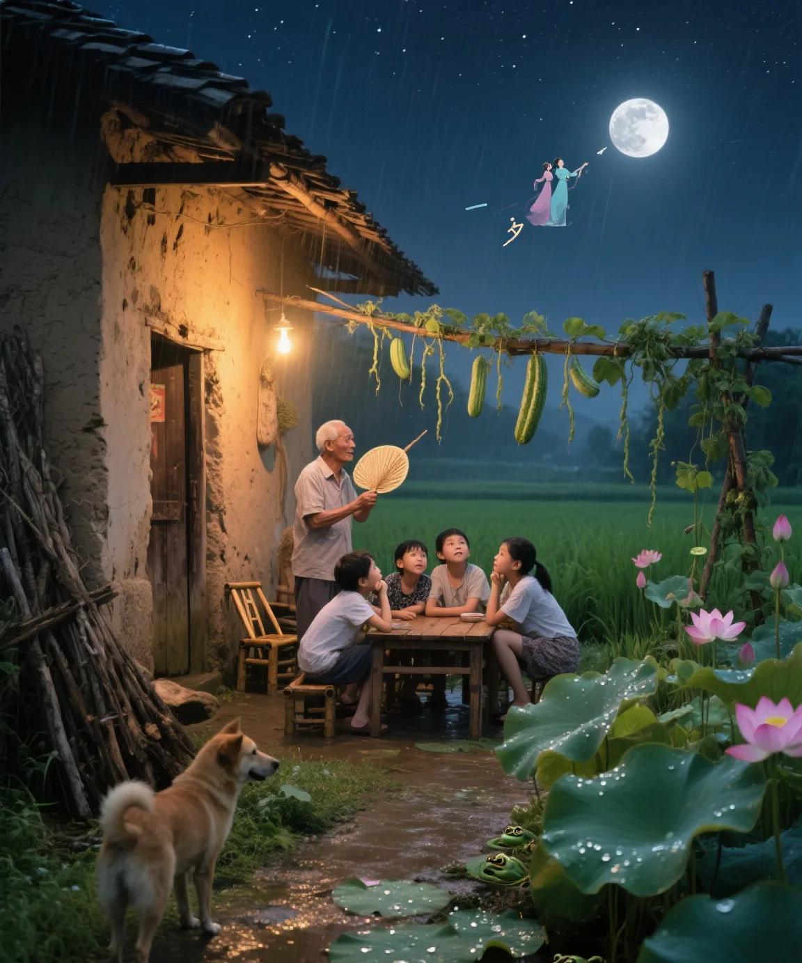 鹊桥仙·七夕节 荷香满径,蛙声盈野,七夕乡村如画。 瓜棚豆架话仙缘,引得那、稚童