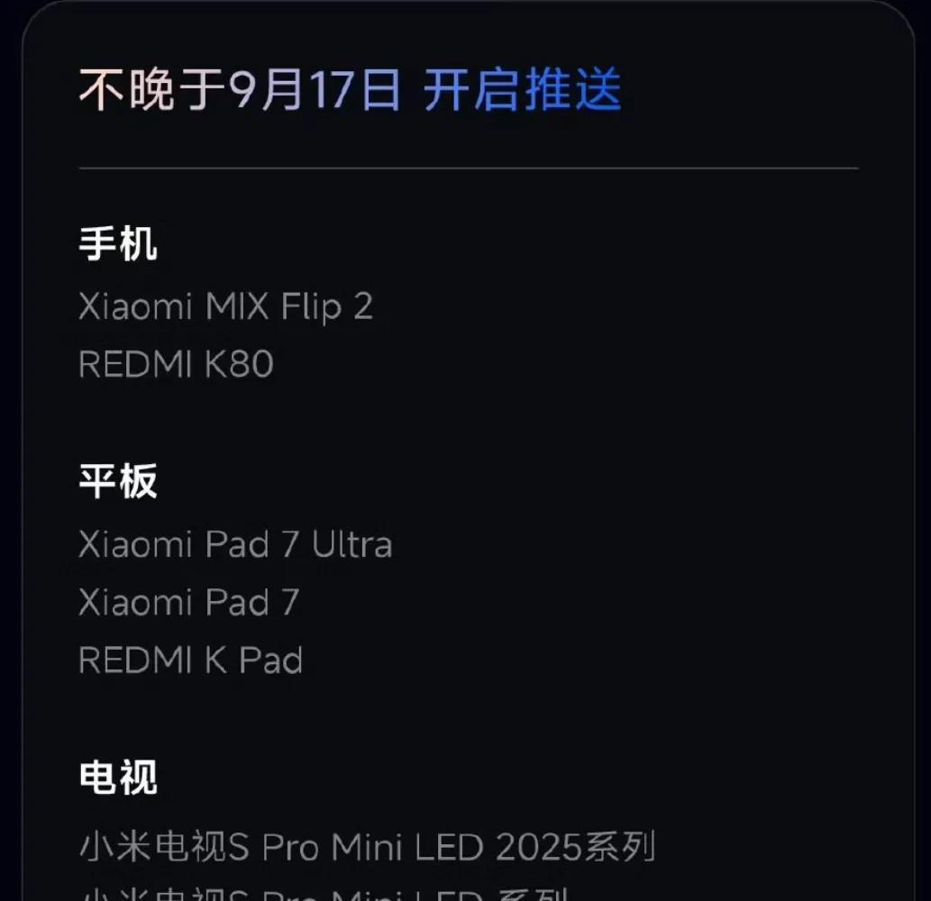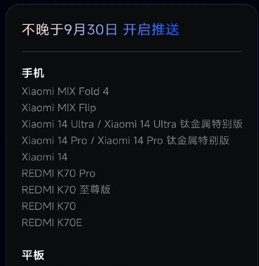 小米澎湃OS3机型推送顺序: 第一批:小米15系列,红米K80部分机型,小米平板