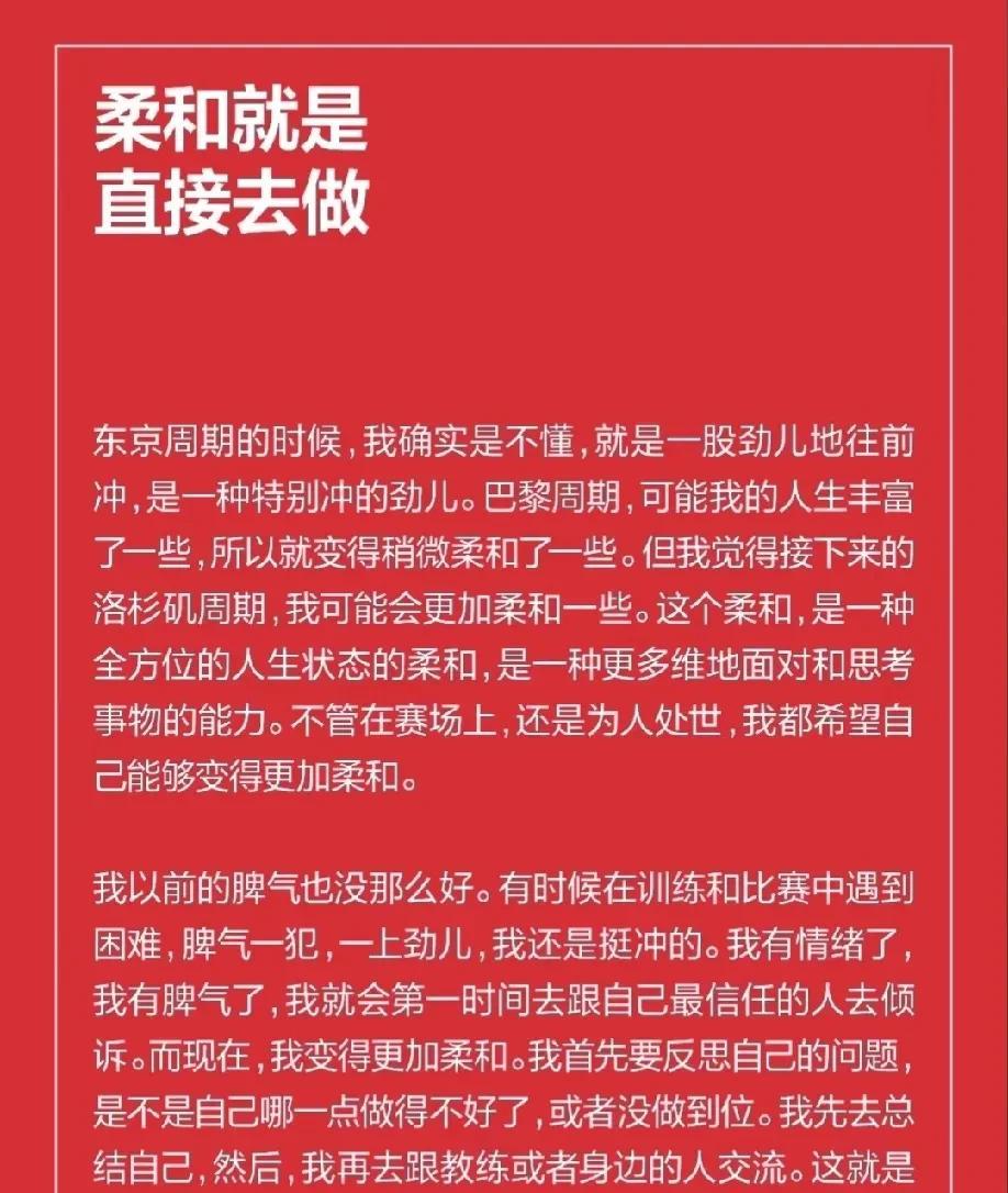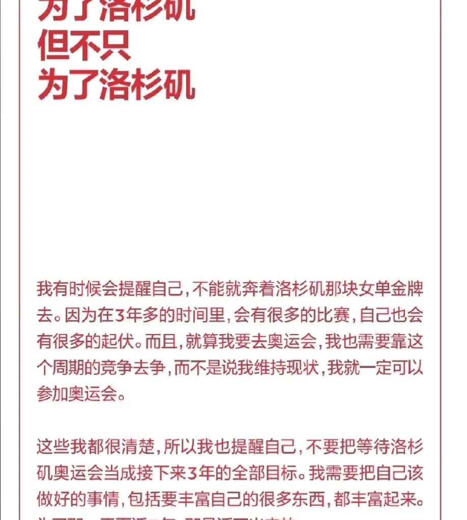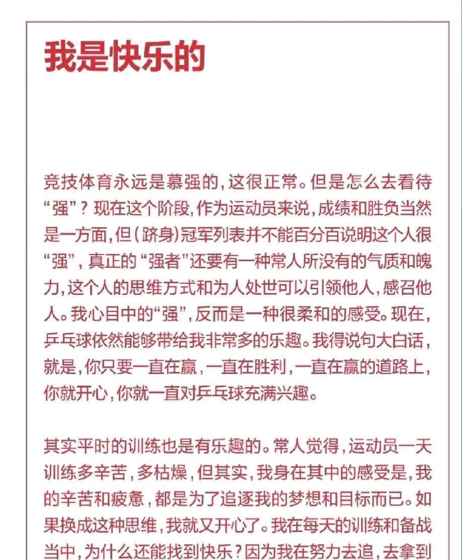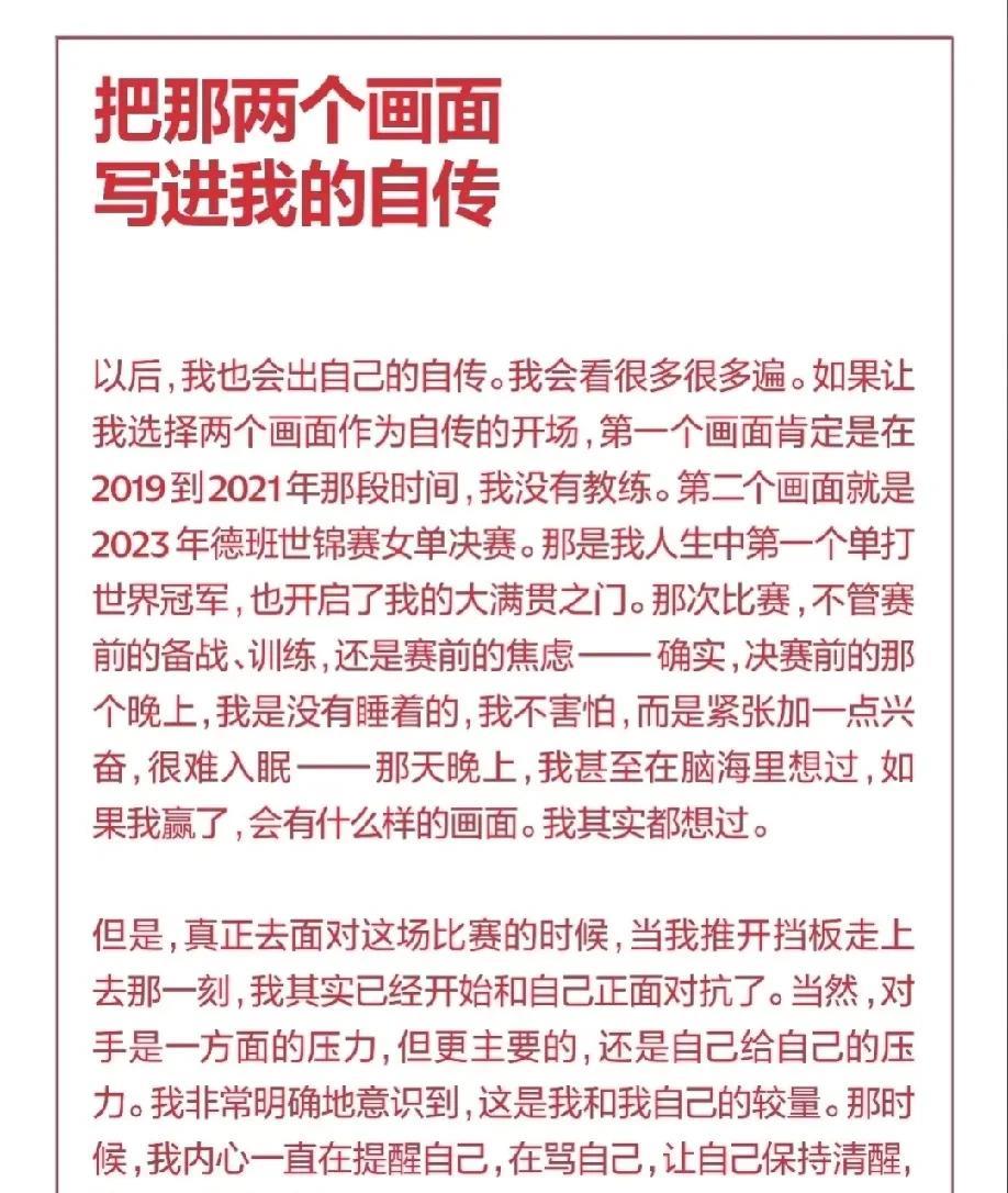 莎莎新杂志的采访,印证了成都封训时的猜测——她没有走出来。在世乒赛之前她确实是压抑的,而为什么压抑,各有各的想法。 现在看她的采访,不但有劲,还柔和,能肯定自己,还能找到自己的节奏。有压力却也有自己的节奏,想赢却也勇敢面对失败。现在的心态更成熟且稳重。 她说得很对,不应为洛杉矶女单那一块金牌而活,难怪在世界杯和世锦赛时,面对曼昱的追分,她不再绷紧,面对鹰眼挑战,也不受影响。 能在所有人面前说出自己要快乐地奋斗,不为洛杉矶那块单打金牌而活,这才是真的释然。很期待,期待她的自传,这比金牌更吸引我! #孙颖莎#