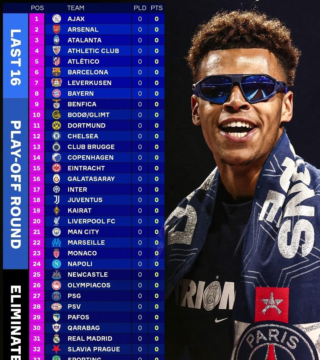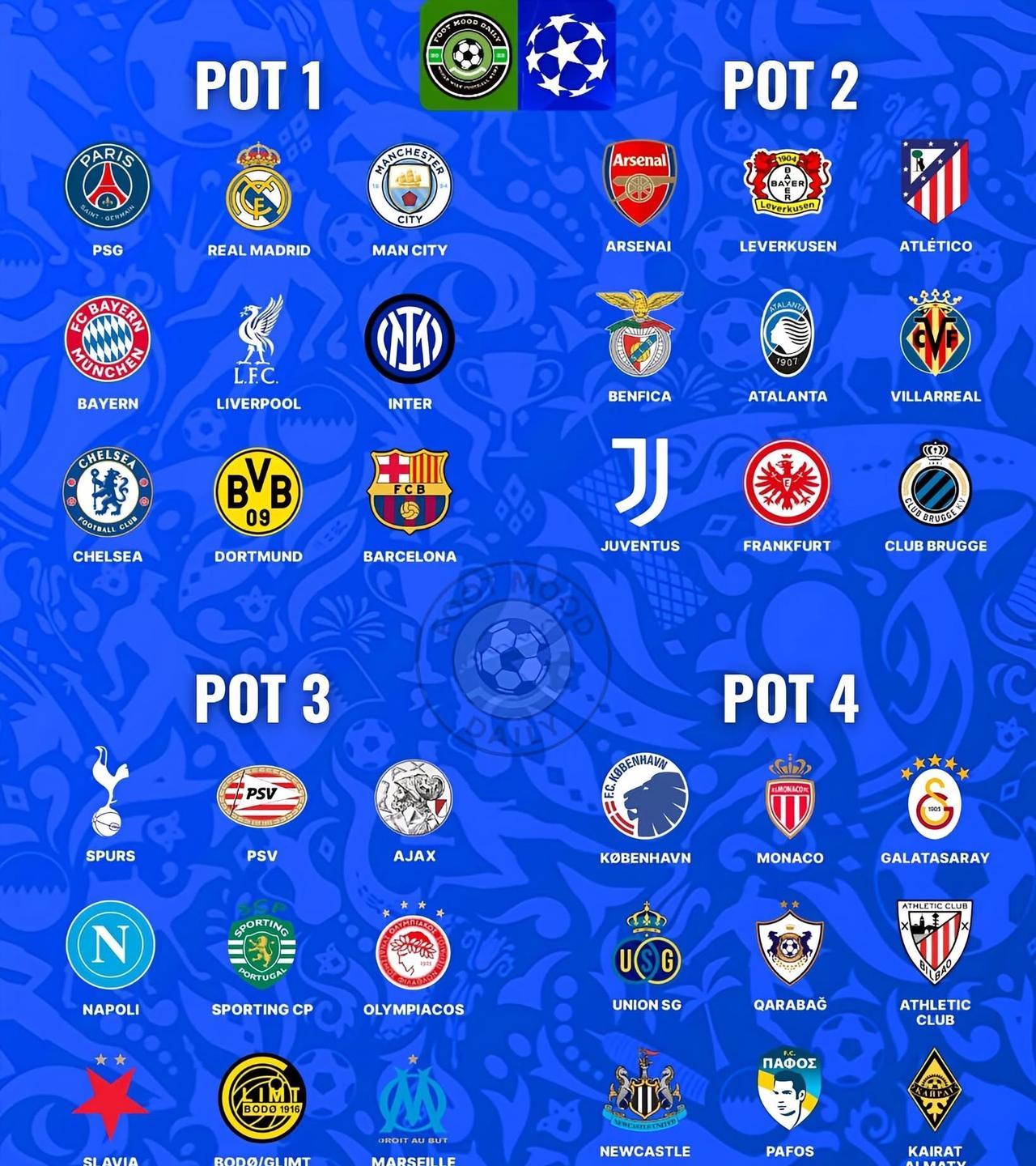 2025/26赛季欧冠附加赛全部结束,36强全部落位,而欧冠抽签仪式将会在北京时间8月29日0时在摩纳哥进行。 英冠联赛采用积分制,具体规则如下: 积分:: 排名:: 积分相同时的处理:: 第一档9个:巴黎圣日耳曼(卫冕冠军)、皇家马德里、曼城、拜仁慕尼黑、利物浦、国际米兰、切尔西、多特蒙德、巴塞罗那 第二档9个:阿森纳、勒沃库森、马德里竞技、本菲卡、亚特兰大、比利亚雷亚尔、尤文图斯、法兰克福、布鲁日 第三档9个:托特纳姆热刺、PSV埃因霍温、阿贾克斯、那不勒斯、葡萄牙体育、奥林匹亚科斯、布拉格斯拉维亚、博德闪耀、马赛 第四档9个:哥本哈根、摩纳哥、加拉塔萨雷、皇家圣吉罗斯联合、卡拉巴赫、毕尔巴鄂竞技、纽卡斯尔联、帕福斯、艾马迪 共有16个国家,36个俱乐部: