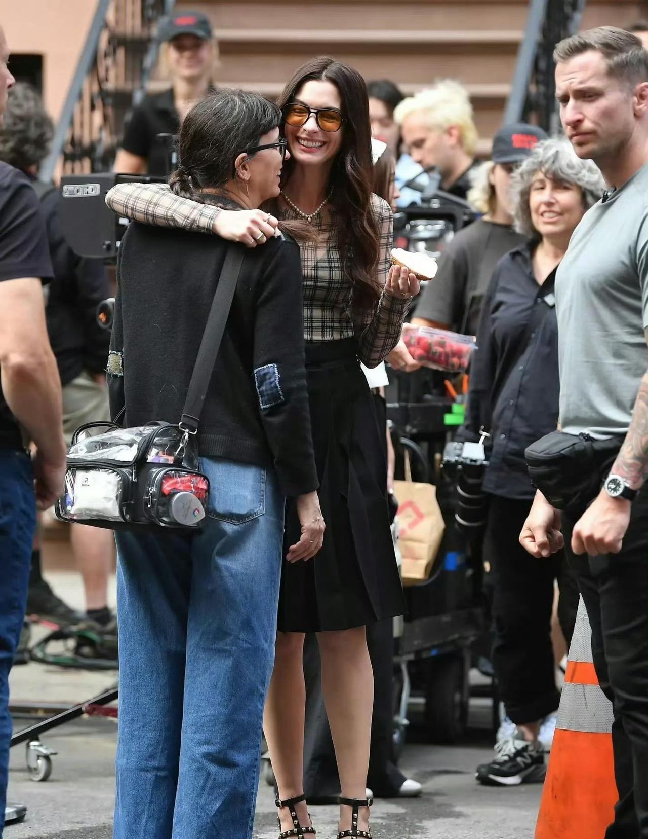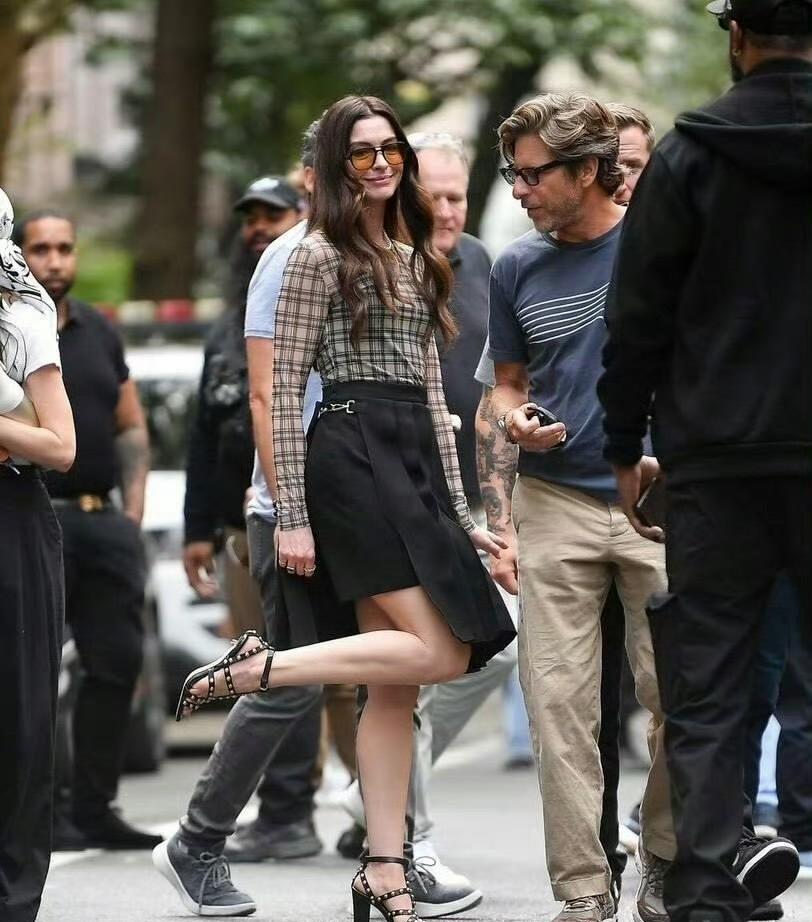 天呐!安妮·海瑟薇在片场摔了一跤,鞋跟都直接断了!但她立马就站起来,特别淡定地跟大家说‘没事没事’,整个动作依然优雅满分~ 果然不愧是演过《穿Prada的女王》的人,这气质绝了!
