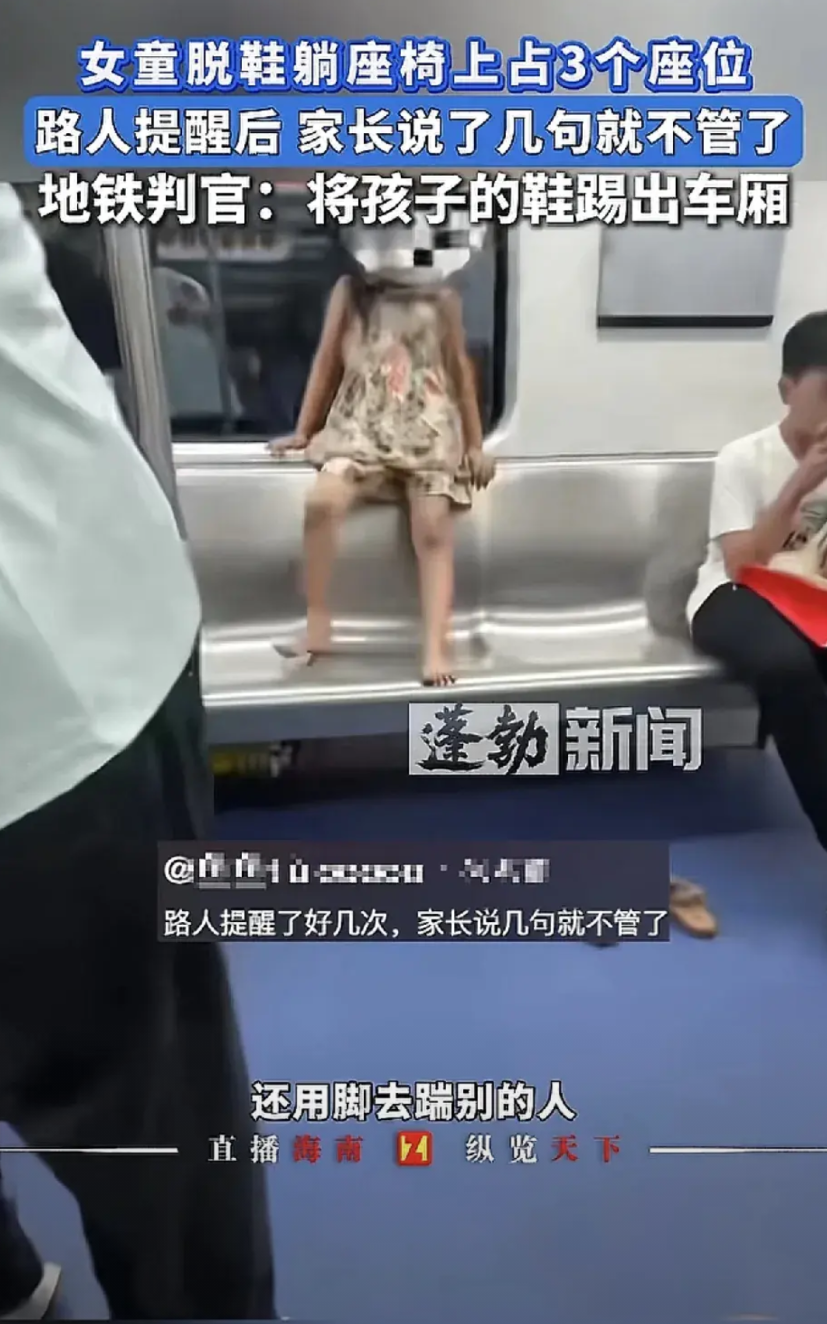 太解气了!家长不管,总有人替你管! 重庆地铁上,一女童霸占3个座位,脱了鞋不是躺着就是在座位上跳,还时不时用脚踹别人。乘客提醒后,家长也只是说了孩子几句就再没管。
