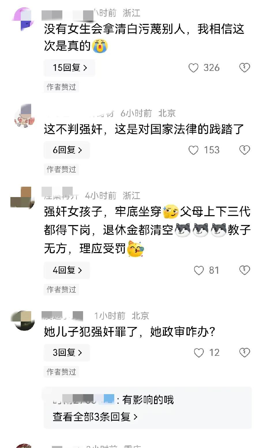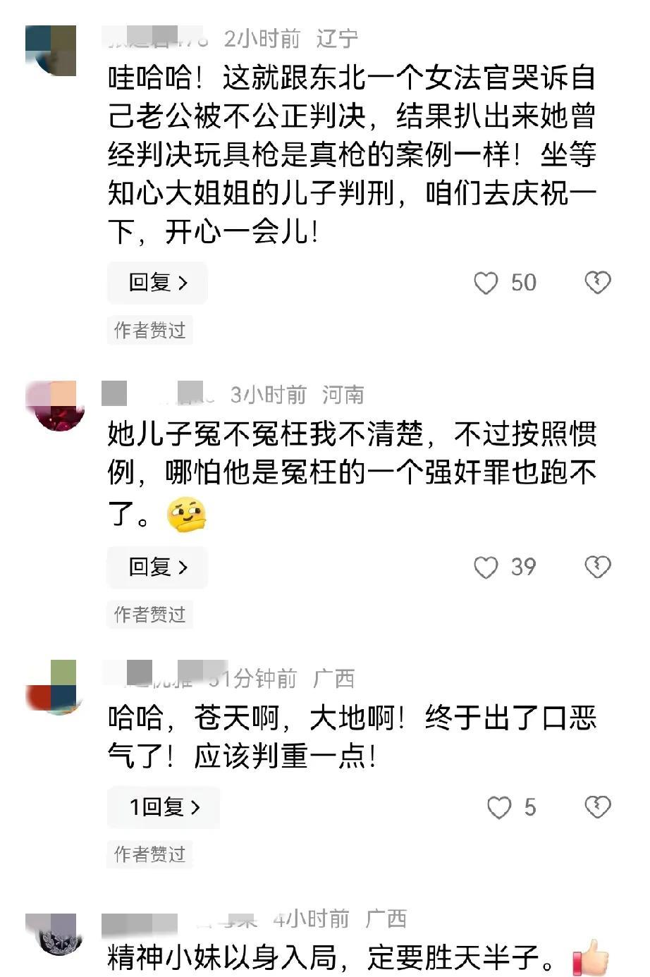 集美的“知名大姐姐”的儿子被人做局,精神小妹告它的儿子酒后强奸,本来你情我愿的事情,现在只要第二天集美反悔了,就可以告了,而且基本是重口供的,也就是精神小妹怎么说,都是事实,这也这些知心大姐姐的女法官开创的先例,现在没想到这个事情落到自己儿子身上去,真的叫天天不应,叫地地不灵,这应该就是所谓的回旋镖了吧!评论区的网友都是齐刷刷呼吁要重判!