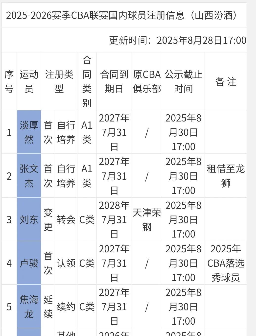 “清华双子星”加盟山西男篮! 北京时间8月28日,山西汾酒男篮更新国内球员注册名单,其中来自清华的原南京同曦球员刘东以及今年的落选秀球员卢俊双双获得注册,其中刘东签下了三年C类合同,而卢俊为两年。同时,焦海龙也续约两年,而赵戌宏在被河北翔蓝“退货”后再次重返山西队。 有着“山西三少”之称的淡厚然和张文杰获得注册,不过淡厚然继续征战NCAA,而张文杰则被租借到广州龙狮。至此,山西男篮国内球员注册人数达18人。