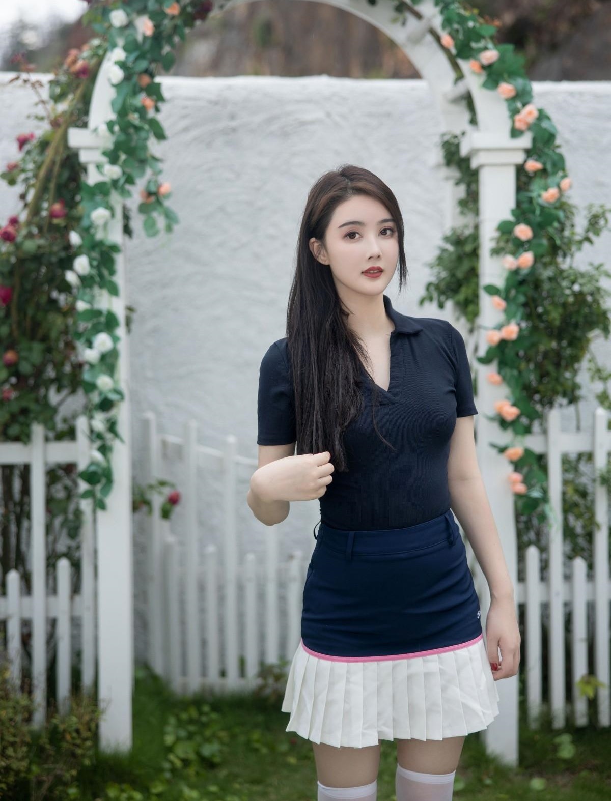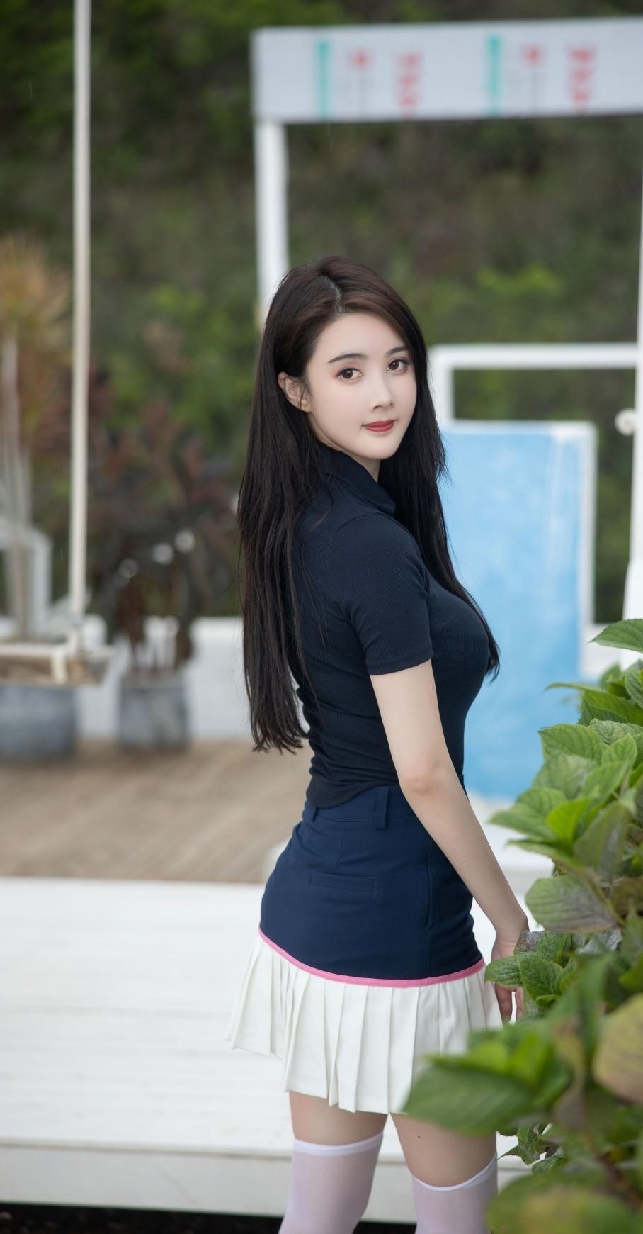 美女穿黑色紧身T恤撞色百褶裙搭配白色过膝长袜小白色好有活力