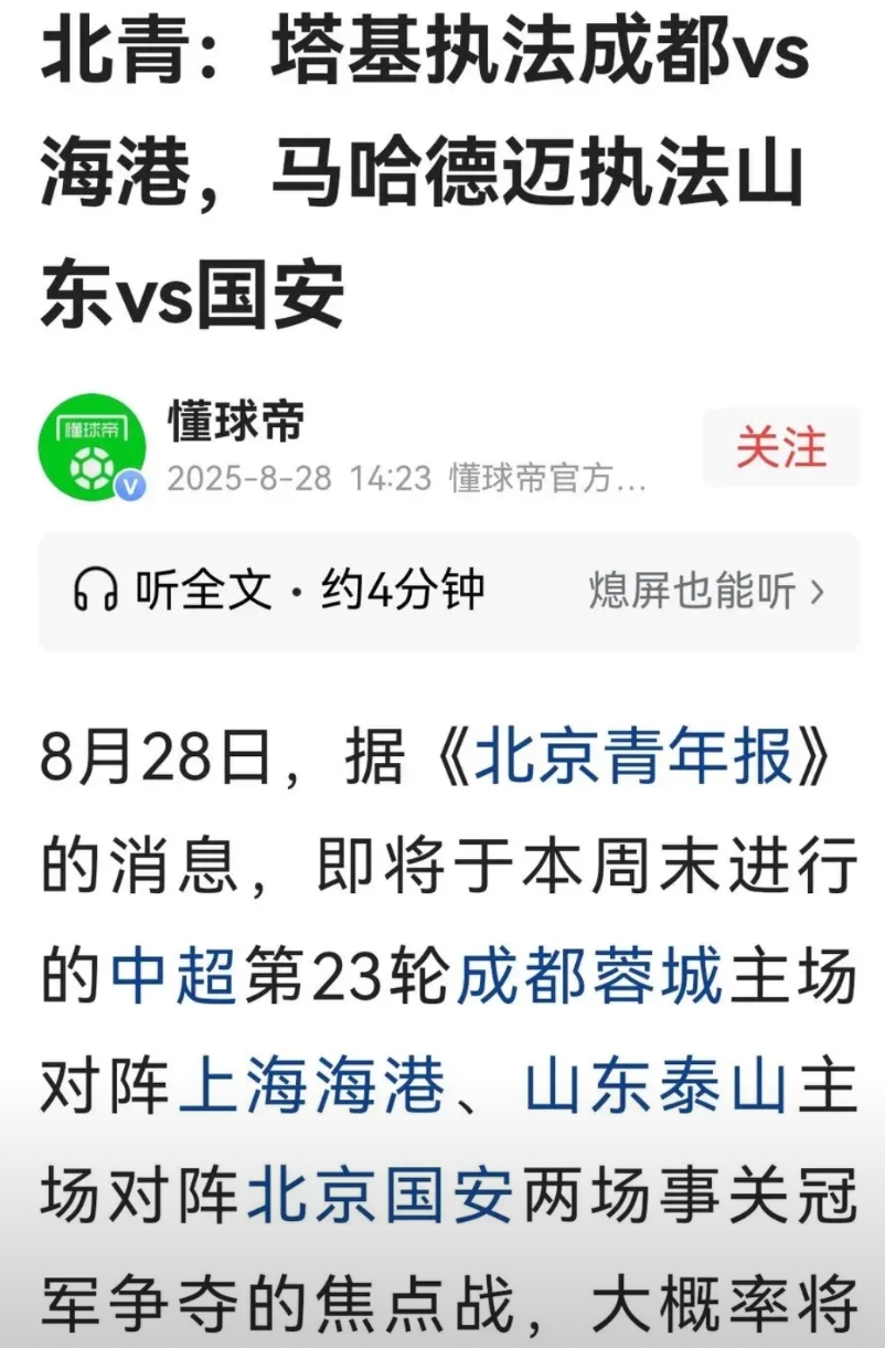 据懂球帝报道,足协顺应民意,将派两名外籍裁判分别执法本周涉及中超冠军争夺的两场比赛。