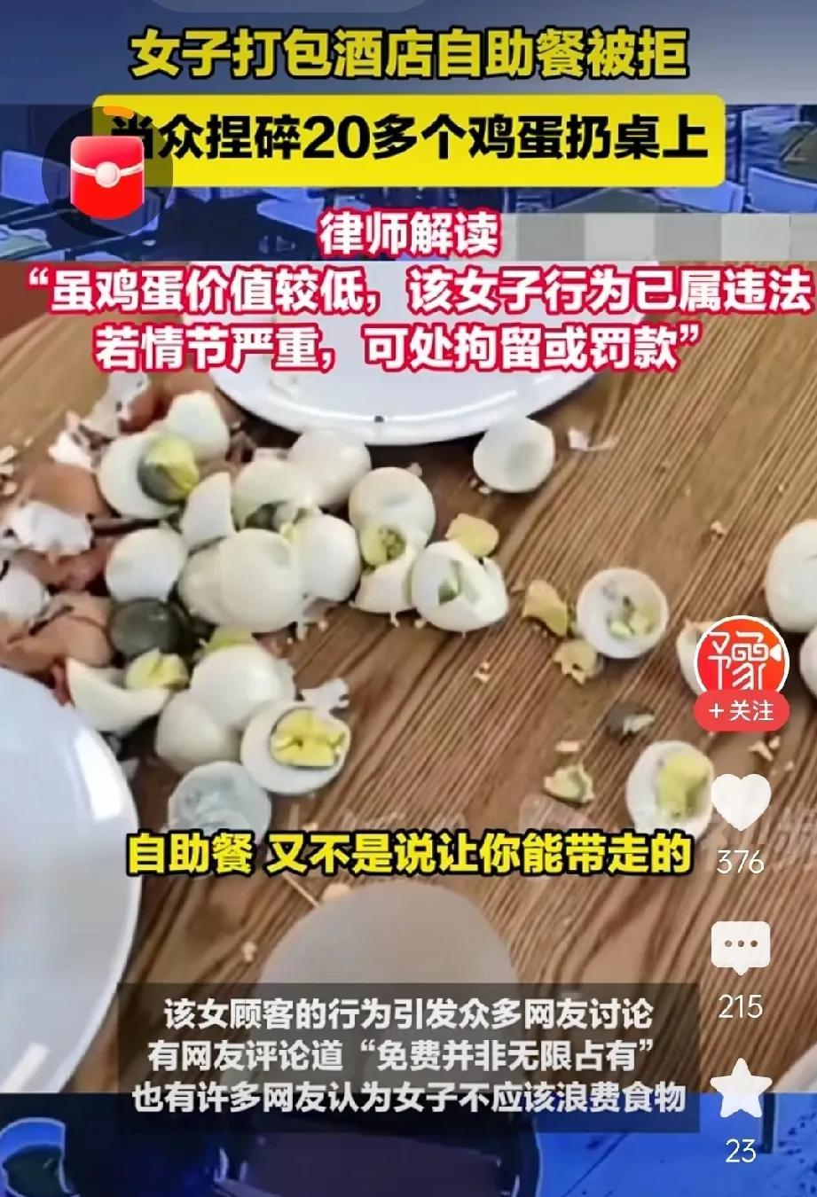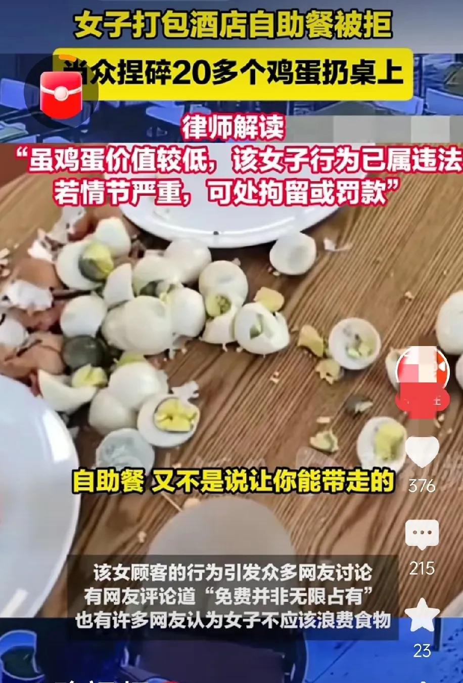 作为老师,不会为这个女人生气,只为旁边七八岁的女孩儿难过。 简单说一下事情经过——母女二人在酒店吃自助餐,估计是出来旅游住酒店,早餐免费。吃完后,觉得拿些煮鸡蛋,可以在路上饿了吃,酒店不允许。这位女士就拿来二十个鸡蛋,全部捏碎,摆在桌上。 视频中,她认真地把每个鸡蛋都扒了皮,放在盘子里,然后一个个捏碎,摆到桌子上,整个过程一言不发,神态专注。 这个事件里,酒店损失了些鸡蛋,女士发泄了情绪,网友看了个乐子。 而那个抱着胳膊,面无表情,一言不发的七八岁女孩儿,是受此事影响,伤害最大者。 这个母亲在告诉她——可以不要按规则去做事,不能满足就破坏,做事情不管对错,我的情绪宣泄最重要。面对酒店我们是客人,我们是弱者,我们怕什么! 父母是孩子的第一任老师,言传身教。 看孩子木然的表情,知道这位妈妈,不是第一次做这种破坏规则的事了。 众目睽睽,酒店服务员鄙夷的眼神下,女孩抱紧胳膊,僵坐在那里,绝望得看着妈妈做。 六零,七零后,做不出这样的事,即使想拿,人家不让,也不会糟蹋,守着孩子更不会去做。 奉劝为人父母者,不能用自己人生的不幸福,影响孩子的一生。 大新说体育。