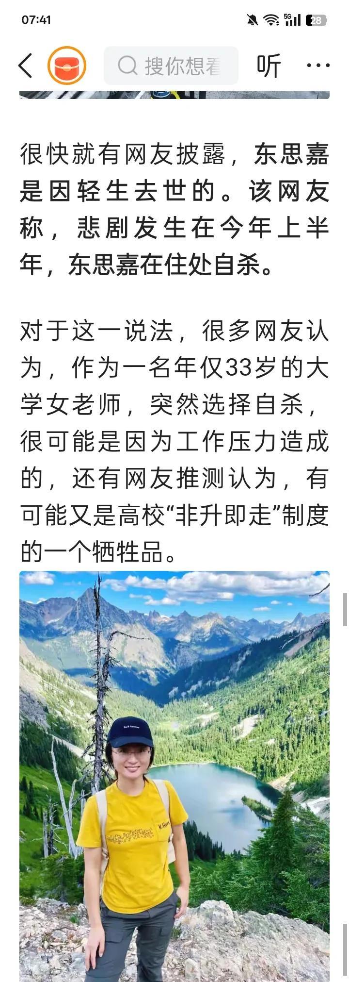 多个网友称,南京大学年轻女博导东思嘉系自杀 近日,南京大学回应了该校33岁年轻女博导东思嘉去世的传闻。称的确去世,但是未说明原因。 多个网友称,东思嘉是自杀,并非因病或者意外去世。 在浙江大学年轻教授杜某去世的时候,众多南京大学毕业的网友留言纷纷指责浙大,一直到今日,还有不少南大网友在我的评论区无中生有的指责这件事。 杜老师离去其实和浙大没有关系。 浙江大学的回应也没有像南京大学这次一样支支吾吾,语焉不详。而是明确说了去世的原因。 后续杭州日报也报道了杜老师是因为和女友的感情因素选择离开,并非考核因素。他的考核绩效是优秀的。 而南京大学目前压力巨大,截止目前,以第一单位且通讯作者单位发表顶刊只有2篇(前五个月甚至是0),而浙大已经接近20篇。所以南大上下都有焦虑感。在华东地区不仅仅看不到浙大尾灯,现在顶刊论文数量只有浙江老二西湖大学的四分之一,比浙江老四浙江工业大学还少一篇。 这个压力感传导到基层教师,考核尺度就越来越紧张。 东思嘉老师去世以后几个月,她所在的实验室发了一篇顶刊,这也是南京大学目前仅有的两篇顶刊中的一篇。 她的同事们把过世的她列为第一作者,这也是一种事后的弥补吧。