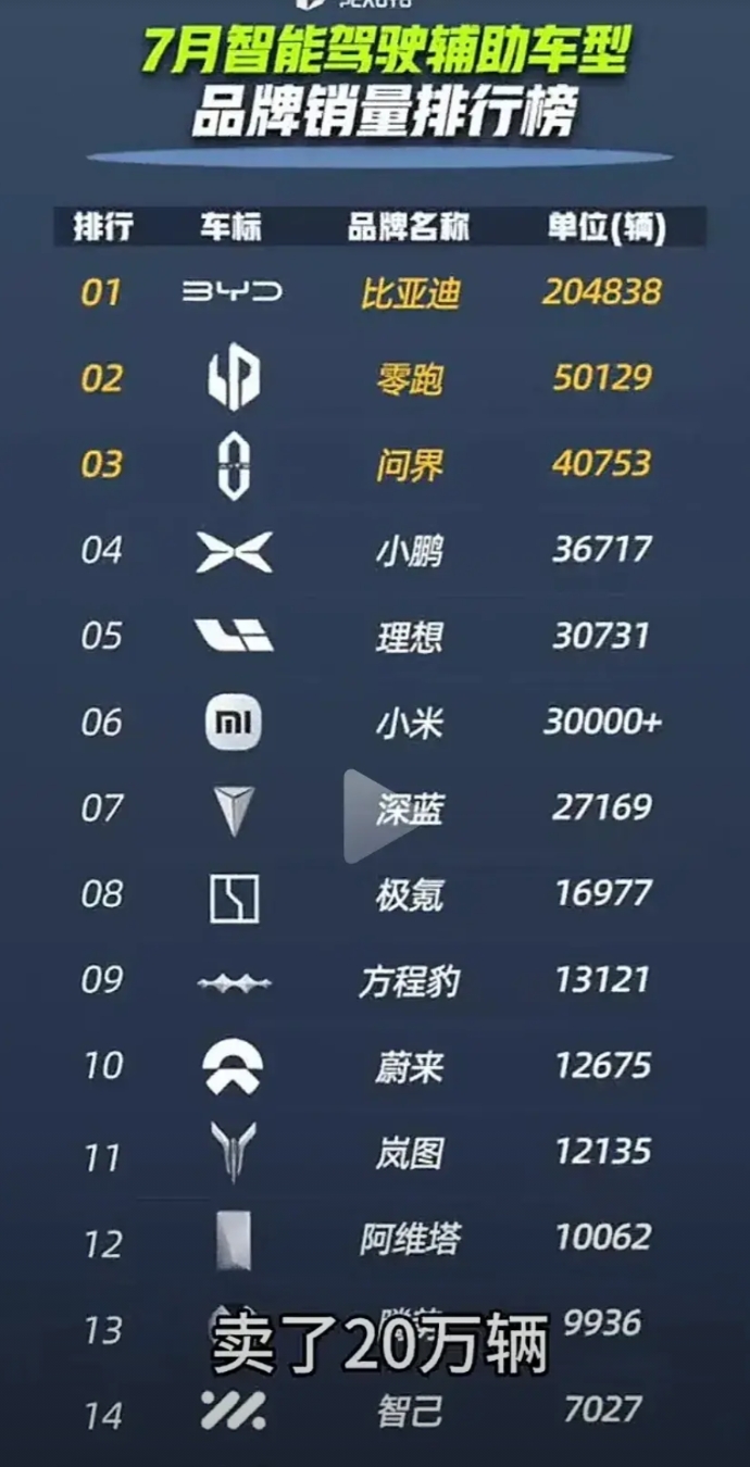 问界M9车主竟然投迪买了仰望U7,然后大吹天神之眼智驾比鸿蒙智驾更好用,然后又定了仰望U8L。看来销量高的智驾进化更快还是有可信度的。 比亚迪7月份多品牌加一起智驾车型销量高达20多万辆,比其它品牌加一起都多。