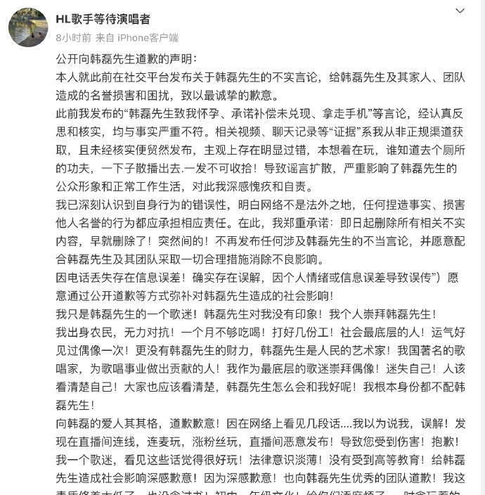 极限反转,原来韩磊是被冤枉的! 曝料出轨的当事人亲自发声道歉了。 8月29日,韩磊出轨的事情迎来极限反转。 韩磊启动司法程序后,爆料者认怂了,她写了千字长文,主要声明了三件事。 第一:发表了关于韩磊的不实言论,郑重道歉。 第二:补偿款、拿走手机等言论,均是编造的。 第三:本想发着玩玩,谁知道发酵太快酿成大祸。 这千字长文一出,韩磊的名利地位全保住了,老艺术家终于又可以堂堂正正的在大舞台唱歌了。 不过,网友并不买账,有人直接了当的说:“钱到位了一切都好办,各位看官可以散去了。” 也有网友说:“娱乐圈有个不成文的规定,要想解决和销毁一切问题,最有利的武器是钱。” 还有网友说:“观众只是女方要挟利用的工具罢了,私下解决不了的事,让网友评评理马上就解决了,到头来被戏耍的只有观众。” 韩磊和女方的这波操作,确实败好感。 先是有鼻子有眼的曝料一通,等网友信了又亲自推翻自己的言论,真让观众摸不着头脑。 既然是私事,为何不私下解决呢? 这样占用公共资源,太不地道了。 那么,你怎么看待这件事?