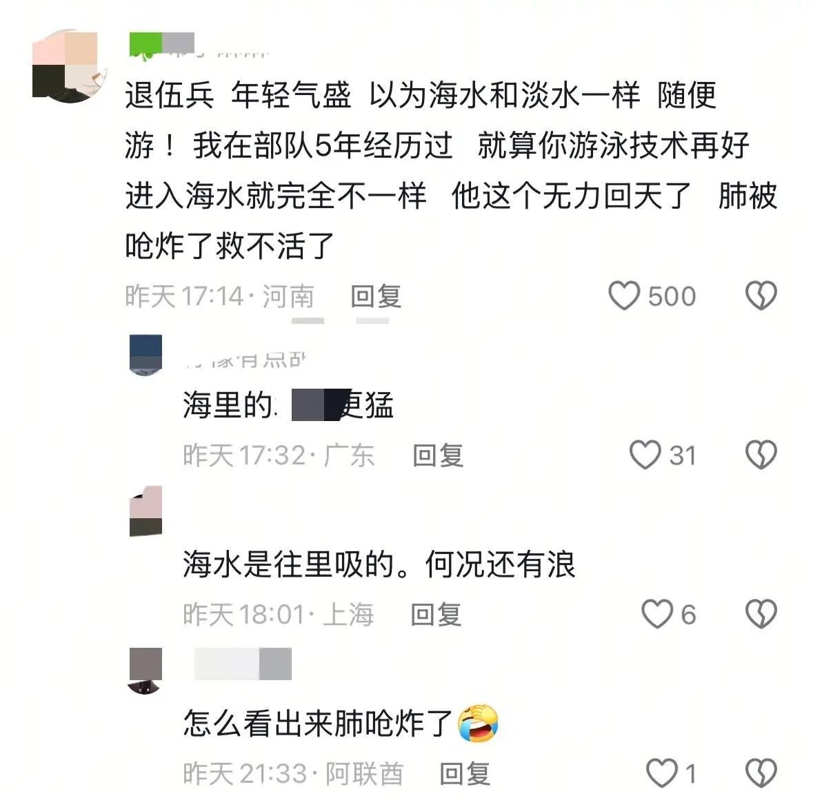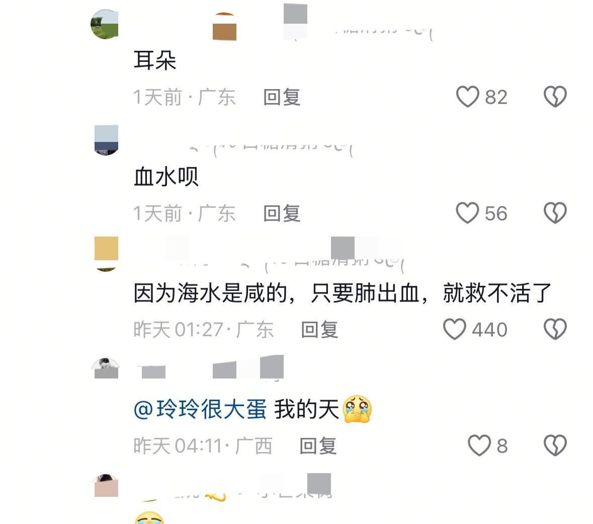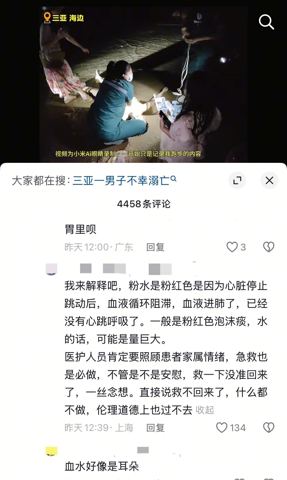 三亚溺亡的游客在被抢救时,[流泪]流出了一滩粉色血水,有专业的网友科普说是他已经炸肺了! 这位游客是四川巴中人,他是一名退役军人。退伍之前,他陪老婆孩子的时间并不多。这次千里迢迢,带着他们来到了心心念念的三亚旅游。 悲剧发生那天,风浪很大,他却执着要下海游泳,妻子压根劝不住他。结果,没过多久,他就溺水了。 被救上来时,他已经没有意识了。看到陪在他身边哭的撕心裂肺的妻女,大家谁也不忍心放弃,一直在努力地对他进行心肺复苏。 抢救过程中,他的瞳孔散大了,并从体内流出来一滩粉色血水,这是一个很不好的信号。 关于粉色血水,有一个网友给出了详细解释: 他溺水后,心脏停止跳动,血液循环阻滞,血液便进到了肺里,一般是粉红色泡沫痰,呈水状的话,可能是量巨大。 这个情况意味着,那名游客已经救不回来了。 事实上,医护人员一看便知具体情况,但还是在尽最大的努力抢救,并安慰他的家属,不要害怕。 这不仅是医德,也是为了照顾患者家属的情绪,给她们一丝念想。如果直接说救不回来了,什么都不做,伦理道德上也过不去! 坦白说,看到这些细节,真的很不好受。一个好好的家庭,就这样破碎了,实在是太让人心疼了。如果这名游客,在关键时候听了妻子的劝告,也许一切都完全不同啊![祈祷][祈祷][祈祷]