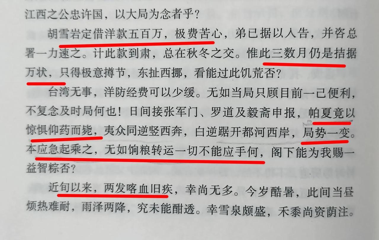 光绪三年刘锦棠以闪电战连克达坂城、吐鲁番、托克逊,阿古柏绝望之下服毒自尽。西征军本可乘机进军,却因粮饷缺乏不得不暂停进攻。 左宗棠致信在兰州负责后勤的副帅刘典、以及山西巡抚曾国荃,无奈地说:本应急起乘之,无奈粮饷转运一切不能应手。 当时朝廷拖欠西征军费已逾三千万两,议借洋款之请尚未落实,左宗棠终日绕帐徬徨,不知计将安出。左宗棠告知刘典,说近十天来,已两次咯血。 ——《左宗棠全集》