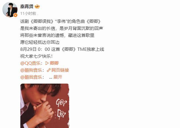 秦霄贤凌晨新歌发布,《卿卿误我》“李伟”角色曲,慢慢地演唱会就有了。 《卿卿误我