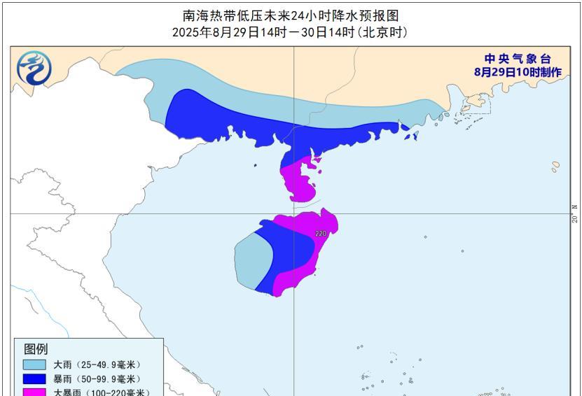 未来台风“蓝湖”不会登陆海南岛,29日起全岛有较强降雨天气!经过一夜的发展,南海热带低压发展缓慢,还没有拿到台风编号户口;今天(29日)中午11时13分,低压最大风力有7级,位于海南三沙市(西沙永兴岛)偏南方向约50公里的海面上。目前, 低压将以每小时15~20公里的速度向西偏北方向移动,强度逐渐增强,可能于今天发展为14号台风“蓝湖”;从路径预报图中看到,“蓝湖”生成后,路径一路向西,没有出现明显北调,中央气象台认为不会登陆海南岛,但靠近三亚沿海时巅峰强度可达9级。虽然未来台风“蓝湖”的路径与“剑鱼”很相似,但这个台风更偏离三亚近海,对三亚的影响不大,主要防范较强降雨带来的不利影响。 从降水量预报图中看到,受低压影响,今天14时至明天(30日)14时,海南岛有大到暴雨,北部和东部的部分地区有大暴雨(100-220毫米);可见,未来台风“蓝湖”的强度虽弱,但造雨能力不容小觑,特别是东半部地区的雨量较大。据海南气象预报显示,今天08时至31日08时,文昌、琼海、陵水、五指山、三亚等东半部市县累计雨量有100~150毫米、局地200毫米以上;大风影响方面,预计今天至明天中午,海南岛东部和南部海面阵风可达9~10级,琼州海峡应该不会停航,大风对陆地影响不明显。除了这个土台风外,9月1日至5日,南海到菲律宾以东洋面热带对流活跃并维持东西向辐合带,或有1~2个台风或热带低压生成!