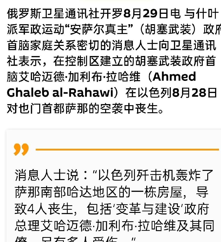 遗憾!胡塞武装遭受重大挫败! 今天的国际媒体报道了一个令人遗憾的消息,胡塞武装在以色列的打击下遭受重大挫败,该武装团体的最高领导人之一的总理牺牲了! 迄今为止仍在抵抗以色列,用各种导弹教训以色列不要对巴勒斯坦人太过压迫的胡塞武装,以及铮铮铁骨和不屈精神蠃得广大网民的喜爱,特别是他们在与美国对战一个月后,逼迫特朗普签署停战条约,更被崇拜英雄的网友们理所当然的视为成功抗击霸权的偶像,并不因为他们是草鞋军而轻视,形像之高远超自诩为反美斗士的伊朗。而今,他们的总理被袭身亡,不仅仅是胡塞武装的损失,更是全世界反霸权阵营的损失,希望这位勇士一路走好,他的事业必将后继有人!