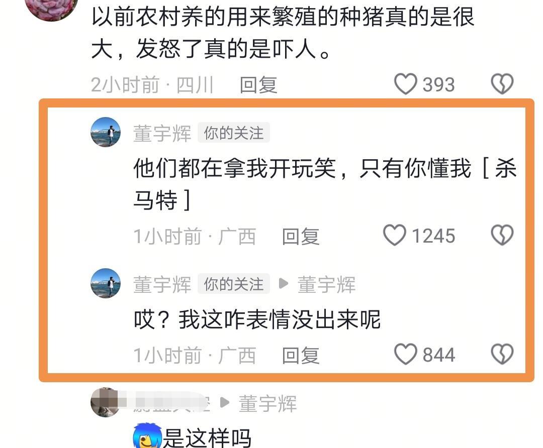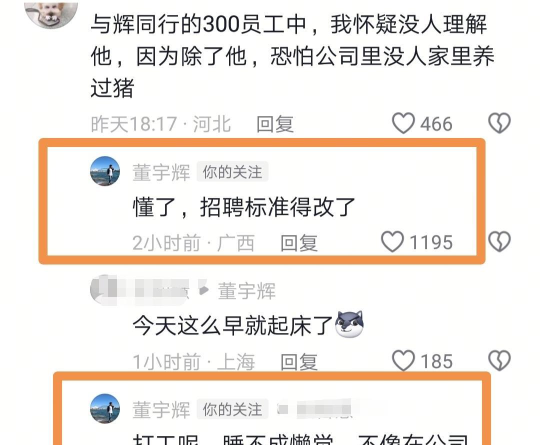 董宇辉这两天咋啦?这哪里像在广西出差,刚刚在评论区直接回复了三个问题,还说要把招聘标准改了。 自从昨天小编发了那头大大大猪,董宇辉都急了,你们咋不信了,真有那么大。 1,有网友说,与辉同行这么多员工,我怀疑没几人理解他,都是些小年轻,繁育母猪别说养过,见过都很少。 没想到董宇辉还专门回复,懂了,以后招聘标准得改了。 下面有朋友回复,其实能理解,现在农村散养猪很少,也不能养,怕污染,00后这一拨没见过很正常。 但他说改招聘标准,可能想督促员工们多学习,有机会多去实地看看。 平常开开玩笑没问题,但在工作中千万注意。 2,董宇辉还在问,为什么他的杀马特表情包出不来,咋回事? 评论区许多朋友按照步骤都出来了,他咋不行,到底哪里不对? 本人实测,在抖音界面评论,按步骤没有问题,但在其它软件,确实就没有了,是不是抖音专属的表情包? 3,有网友关心,彪哥今天咋这么早起床了? 董宇辉也及时回复,在外打工了,睡不成懒觉,不像在公司。 #董宇辉#