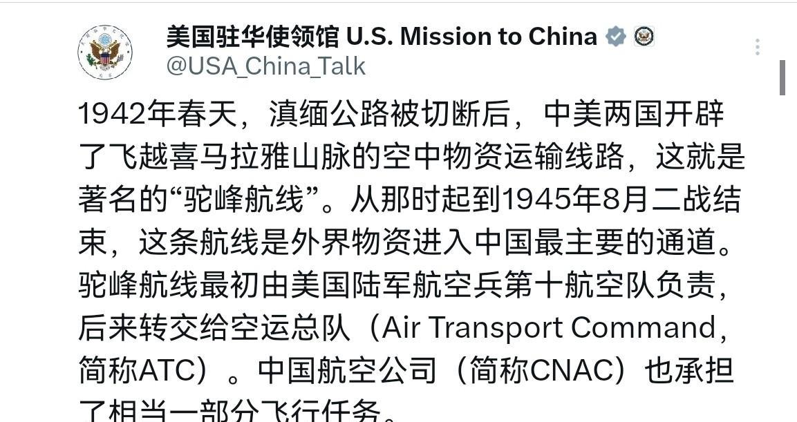 罕见!美国驻华使领馆这一次终于跟我们在一个频道了!在我们即将举行抗战80周年纪念之际,8月29日,美国使领馆刊文表示,1942年春天,滇缅公路被切断后,中美两国开辟了飞越喜马拉雅山脉的空中物资运输线路,这就是著名的“驼峰航线”。从那时起到1945年8月二战结束,这条航线是外界物资进入中国最主要的通道。 珍贵的照片显示,美国第14航空队308轰炸大队,当时他们的主要任务是支援中国地面部队,从空中打击敌方目标。第308轰炸大队还在维持盟军补给线方面发挥了关键作用。308轰炸大队组建后,第一件事就是往返驼峰航线,运输物资。很显然,在我们即将举行抗战胜利80周年大阅兵之际,美国方面这是罕见的以回顾历史的方式,跟我们保持在同一频道了。 说实话,在当下中美博弈的背景下,美国这样的动作,或许这也是美国对我们释放善意,希望进一步稳定中美关系的一种方式。从历史的角度而言,中美并肩抗击法西斯,共同为和平和正义而战,美国“飞虎队”同中国军队冒险开辟驼峰航线,付出了巨大的牺牲,中美双方通过血与火铸就了两国人民之间深厚的友谊。这些历史事实证明,中美是能够合作的,可以合作的。 从这些历史中相信美国也不难得到启发,那就是中美两国的合作,既能捍卫正义,也能造福于两国人民。无疑,历史是现实最好的镜鉴。当下中美两国的关系面临很多困难,但是只要两国以平等,尊重,互利,共赢的方式打交道,摒弃霸权主义做派,中美两国能够相互成就,开创未来。中美两国关系的大道是合作,而绝不是对抗。我们相信美国最终会意识到这一点。