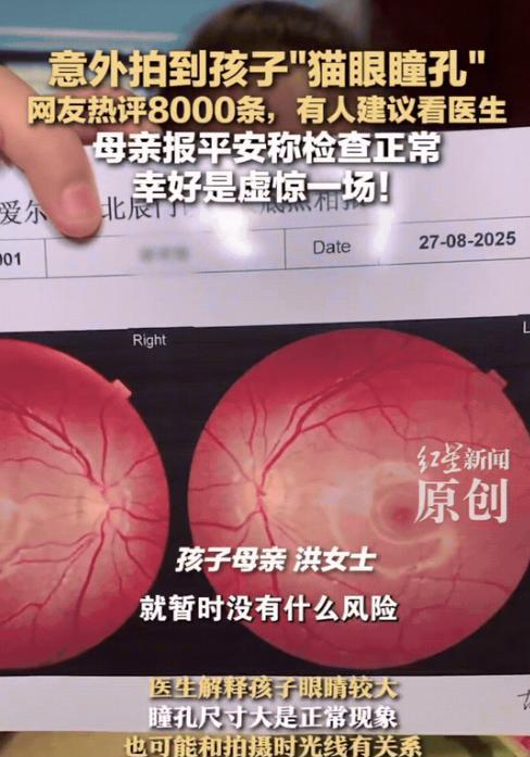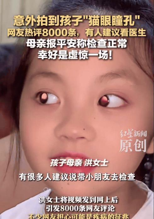 湖南,一位妈妈在家随手给女儿录了段视频,回放时突然发现——孩子的眼睛在镜头里居然像猫眼一样,瞳孔泛着异样的光。她心里一紧,又把视频反复看了几遍,越看越觉得不对劲。 犹豫片刻,她把视频发到了网上,本是想问问有没有人见过类似情况,没想到短短几个小时,评论爆了。八千多条留言几乎都在说同一件事:“快带孩子去医院检查!这可能是一种叫‘白瞳症’的病,不能拖!” 第二天一早,她带着女儿急匆匆往医院跑,还没等医生上班,就在门口等着挂了第一号。等轮到检查时,她先把视频拿出来给医生看 医生看了半天,发现孩子眼睛用肉眼看完全正常,为了保险起见,又安排了专业的眼部仪器检查,结果显示一切健康 医生也纳闷,后来告知妈妈:孩子瞳孔偏大,加上拍摄时光线角度凑得巧,可能就出现了这种“猫眼效果”。既然没什么症状,日常注意观察就好,不必过度担心 很多人疑惑:为什么会出现“猫眼瞳孔”? 其实这种现象在拍摄中并不算特别罕见。大多数情况都与光线有关:比如手机灯光直射眼睛、暗环境下开闪光灯、或者孩子瞳孔天生较大,都可能在镜头中形成类似猫眼的反射。这是一种光学现象,而不是疾病本身 当然,网友的提醒也不是瞎说的。真正的“白瞳症”通常表现为瞳孔区出现白色或黄白色反光,确实可能是一些严重眼病的信号,包括先天性白内障、视网膜病变,甚至视网膜母细胞瘤等 因此,如果发现孩子眼睛有异常反光、视力下降、斜视或红肿等症状,及时就医是完全正确的 最后想说,网络提醒能带来好的帮助,但也可能放大焦虑。好在最后是虚惊一场,孩子平安健康,就是最好的结果