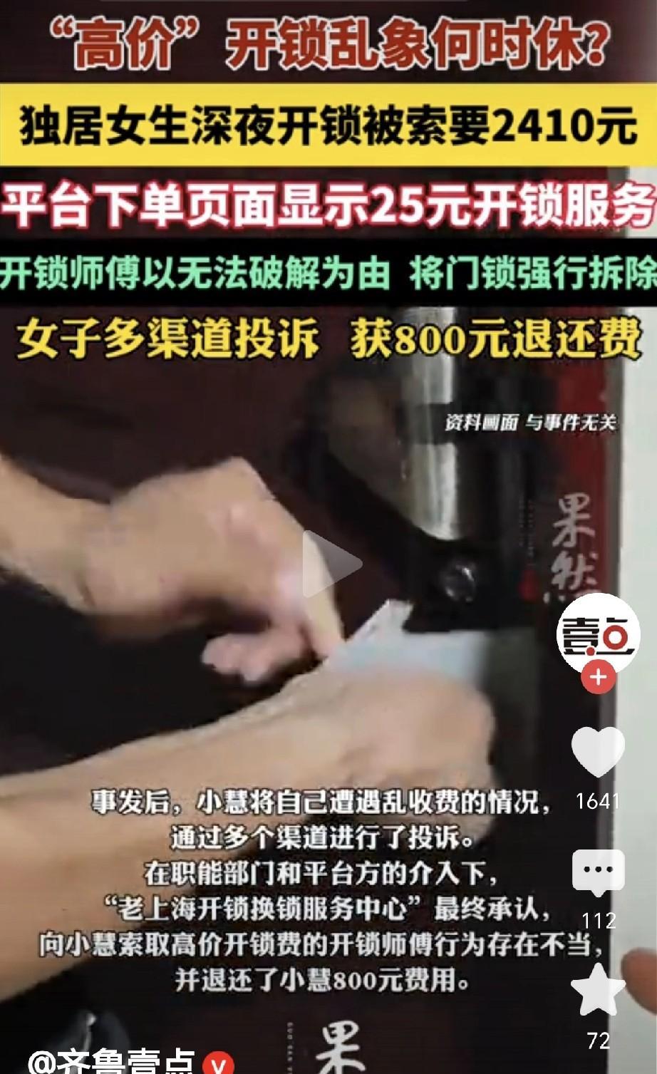 上海,一女子凌晨回家,没带钥匙,立刻在网上找开锁师傅,网上标价,开锁25元,女子