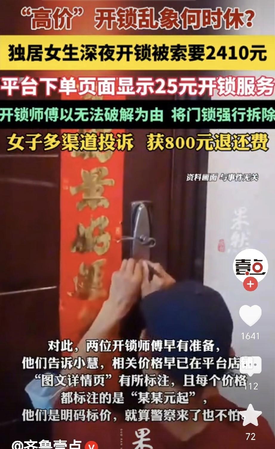 上海,一女子凌晨回家,没带钥匙,立刻在网上找开锁师傅,网上标价,开锁25元,女子下单,不大一会,来了两个开锁师傅,俩人鼓捣半天,说他们打不开,没等女子说话,他们直接把门锁拆了,换了把新锁,要价2410元,不给钱不走,他们扬言,报警也不害怕,女子独居,惹不起他们,讨价还价,支付了1800元,开锁的才走,之后,女子多方投诉,谁知结果却不尽人意! 小慧独自居住,一个人自由自在,可是最近她遇到一件事情,令她心有余悸,有些害怕了。 2025年8月16号,小慧外出,忙了一天,等她回到家门口时,已经凌晨1点。 小慧打开包包,一顿翻找,突然发现,出门时竟然忘带钥匙。 她一阵懊恼,这么晚了,进不去家门,她疲惫不堪,本来打算,回到家就赶紧休息。 她心里埋怨自己疏忽大意,出门时不知道检查东西,可是这时,事情已经发生,当务之急,是要把锁打开才是。 她立刻在网上平台里寻找,找到一家开锁店铺,上门开锁的标价是25元,这价格不贵,小慧心里能够接受。 于是,她立刻下单,要开锁师傅前来开锁,不大一会,两个开锁师傅匆匆赶到。 他们在门锁上一阵鼓捣,看起来很费劲的样子,俩人折腾了半天,然后告诉小慧,他们打不开锁。 小慧一愣,还没来得及回答,还没想好下一步咋办,只见那两个开锁的师傅,嘁哩喀喳,就把旧门锁给拆掉了。 小慧惊呆,那俩人手底下速度很快,立马拿出一把新锁,几下功夫,就给装到了门上。 新锁装好,俩人面带得意,张口就问小慧要换锁钱2410元。 小慧瞬间惊掉了下巴,你们标的价格是上门开锁25元,你们如果打不开,我可以另外找人开锁。 我没叫你们给换新锁,是你们自作主张就把旧锁拆了? 再说,一把新锁哪里能值2410元,这个价格,像狮子大口! 二人不愿意了,他们告诉小慧,他们明码标价,标注的价格都在页面详情里有所注明。 每一项的标价收费都是多少多少元起,是小慧自己没看明白,没理解25元,是标注的最低价格。 开锁的又说,他们收费没任何问题,换一把锁芯就是580元,他们的锁体是防撬锁体,安全系数高,收费500元。 另外,锁把手收费480元,夜班费150元,强开费用300元,安装费是200元。 小慧惊呆,明明是换了了一把新锁,还能这样拆解收费? 再说,小慧一算,开锁师傅报的这些价格,加起来也不过2210元,另外200元,是哪里来的? 那2人睁着眼睛,说着谎话,他们告诉小慧,锁是你自己挑的,锁芯锁体也都是你自己选的,我们安装时也告诉过你细节,是你自己忘记了吧? 他们看小慧不肯给钱,又进一步说到,我们是明码标识,报警我们也不怕! 小慧看着他们,这两个人,身材高大,小慧在他们跟前显得又瘦又小,她心里一阵害怕。 小慧和他们理论,二人往门上一靠,不给钱我们不走,小慧没法,又和他们讨价还价。 俩男子说啥不走,钱不到手,这事没完,小慧知道,这大概是看她孤身一人独居,连哄骗带吓唬,觉得她一个人好欺负。 可是她一个女子,身单力薄,力量悬殊,根本无法和两个男子对抗。 她尽力争取,好说歹说,那两人才同意,要小慧给他们转账1800元,他们才会离开。 小慧转账后,2人离去,小慧回屋,立刻反锁了大门。 她忍不住心里委屈,难受的想哭,立刻在多渠道给予了投诉。 最终,相关部门和平台介入,开锁中心承认,换锁师傅索要高价,确实存在不当。 最终,二人返还小慧800元。 那么,这件事在法律上是怎么认定的呢? 《价格法》第14条规定: 利用虚假的或者使人误解的价格手段,诱骗消费者与其进行交易,属不正当价格行为。 平台标价开锁25元,但开锁师傅实际收费却高达2410元。 商家以“某某元起”这种模糊方式标价,未对各项收费项目作出细化告知,侵犯了消费者的知情权和公平交易权,违反了明码标价应当真实准确的规定。 《消费者权益保护法》第55条规定: 经营者提供商品或者服务有欺诈行为的,应当按照消费者的要求增加赔偿其受到的损失。 增加赔偿的金额为消费者购买商品的价款或者接受服务的费用的三倍。 开锁师傅以低价吸引消费者下单,实际却强行拆除门锁并安装高价锁。 开锁人利用消费者深夜独自在家的不安心理迫使其付款,符合欺诈的主观故意和客观欺骗特征。 开锁人侵犯了消费者的知情权和公平交易权,存在消费欺诈嫌疑。 《刑法》第226条规定,以暴力、威胁手段强买强卖商品、强迫他人提供服务或者强迫他人接受服务,情节严重的,构成强迫交易罪。 开锁人员在深夜面对独居女性,利用被害人孤立无援、不敢反抗的恐惧心理,形成无形的胁迫感,迫使被害人接受明显不对等的高价交易。 若达到相关司法解释规定的立案标准,如造成直接经济损失两千元以上等,则可能构成强迫交易罪。 对此,你怎么看? 关注@王哥说法学法律知识 #头号创作者激励计划#