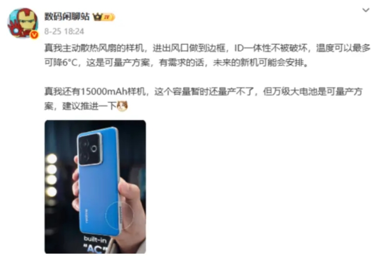 真我手机在七周年庆典上推出全球首个手机空调制冷散热技术,实现“三合一”散热,背面降5℃,正面降6.2℃,还具备冰感变色工艺。同时,展示了15000mAh概念机,虽尚未量产,但预示未来趋势。