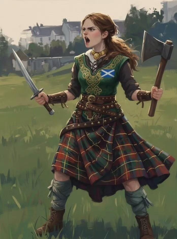英勇的苏格兰小姑娘,为了保护12岁的妹妹,这位14岁的小姑娘拿起了刀斧与意图不轨的犯罪分子正面硬刚。 事后,她也因为带着“武器”被警方带走了,苏格兰人一下子沸腾了,各路大仙开始用手中的画笔支持声援这个小姑娘。 苏格兰七百多年前的威廉·华莱士被砍头之前的呐喊声即将再次响起。