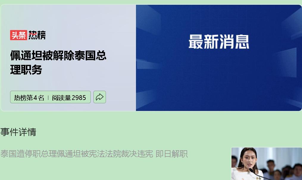 佩通坦栽了。这位泰国史上最年轻女总理,因为和柬埔寨大佬洪森的一通私聊电话,直接被宪法法院炒了鱿鱼。录音里她喊洪森“叔叔”,还骂军方高层是“疯子”——保守派等的就是这一刻。 表面是外交翻车,实则是权力绞杀。36名参议员火速联名弹劾,第二大执政党“自豪泰党”(军方嫡系)立刻拆台退出联盟。8月29日,9名法官闭门投票裁定她“违宪”,全程不到24小时。熟悉的配方:过去16年,5位总理被法院罢免,佩通坦是他信家族第三个“中招”的。 为什么保守派急眼? 她踩了两条红线:一是动军方蛋糕,二是他信家族光环不灵了。去年泰国经济烂摊子没解决,民众耐心耗尽,保守派直接掀桌——“民选派?现在该我们坐庄了” 。 更狠的是制度陷阱。2017年军政府修的宪法,让非民选的宪法法院成了“终极裁判”。去年刚废掉改革派“前进党”,今年又干掉佩通坦。泰式民主?不过是轮流坐牢的剧本。 现在泰国政坛彻底乱套:内阁重组还是提前大选?为泰党支持率暴跌,反对党摩拳擦掌。但有一件事很清楚:军方和王室的人,又要笑了。#佩通坦被解除泰国总理职务#