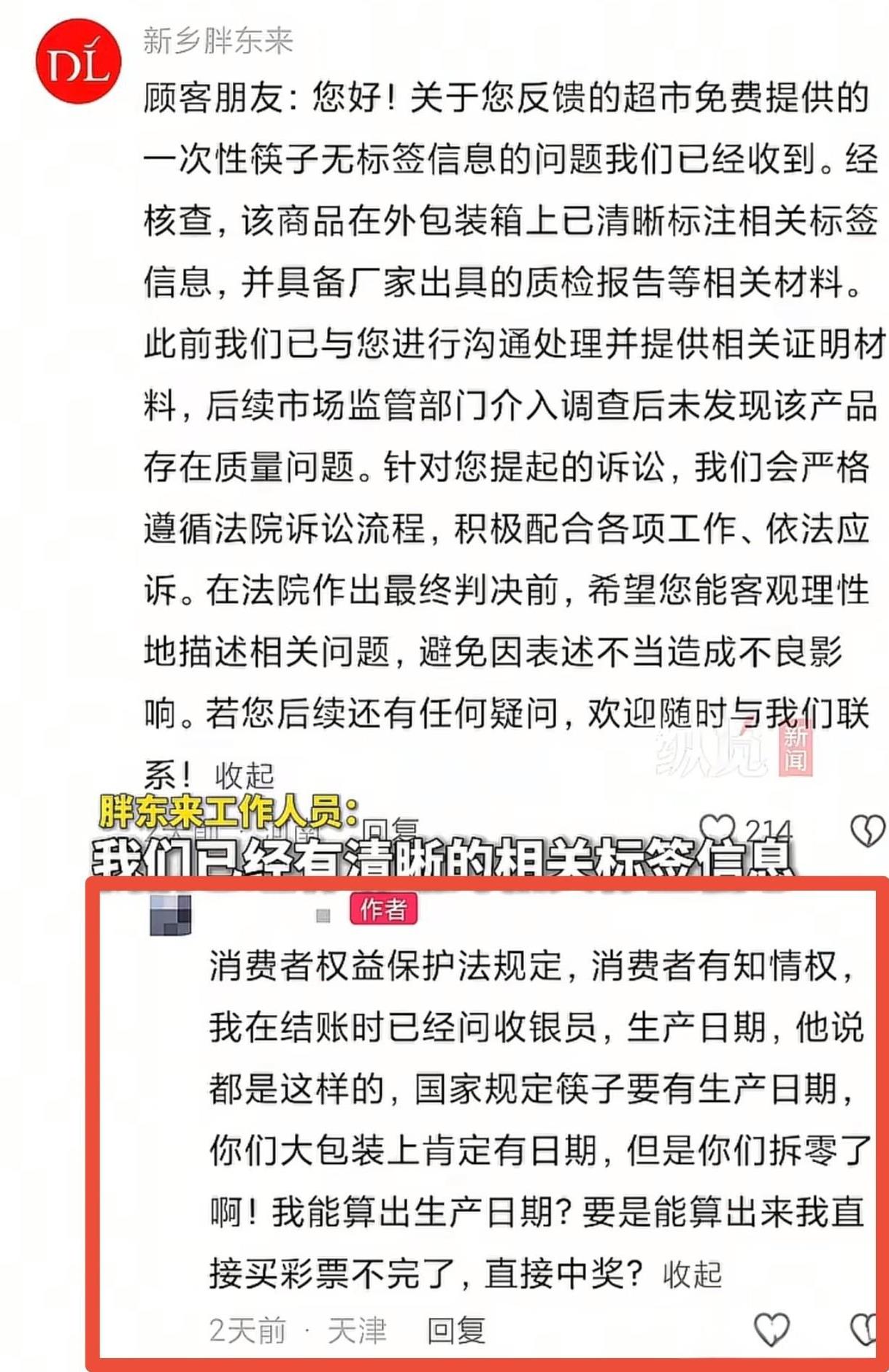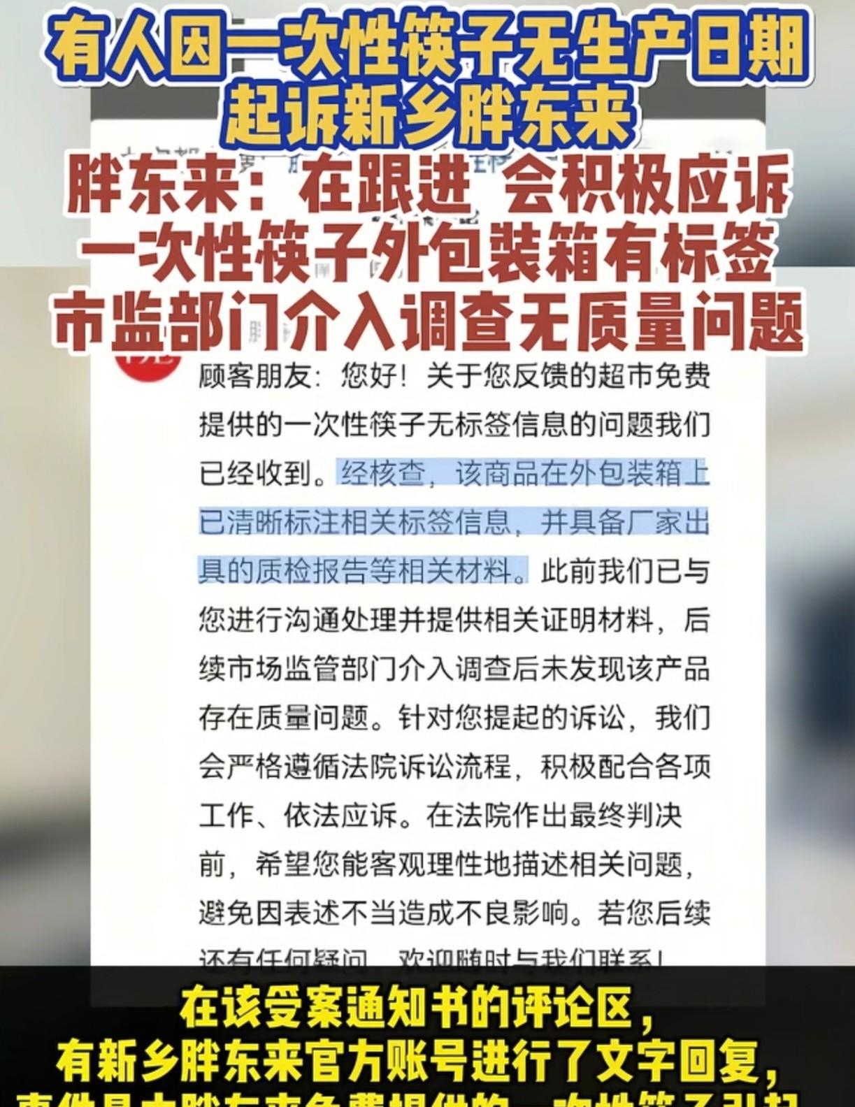 胖东来要是输了这场官司,估计全国的饭店和快餐店都可以起诉一遍了! 真是闲着发慌,一次性筷子拆了外包装还剩下独立包装后,没有相关标签信息不是很正常吗? 然而,一名天津用户在胖东来后续,使用了免费提供的一次性筷子,他没看到标签信息,就判定为三无产品。 随后就把胖东来给起诉了!!! 胖东来对此事的回应也明确说明,在外包装箱上是清晰标志标签信息的。 只是该用户觉得自己应该有知情权! 这明显就是鸡蛋里挑骨头的事,按照“天津筷子哥”的意思,以后牙签,一次性水杯和一次性手套都要印上生产日期等相关标签了。